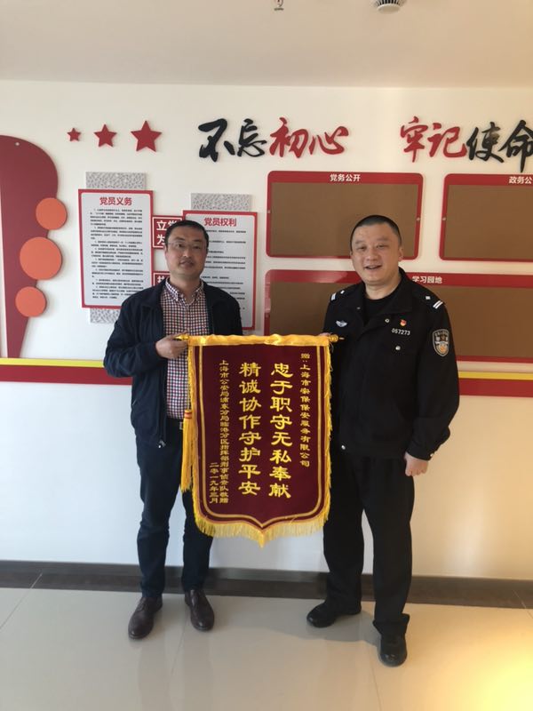 2019年3月19日,浦東公安分局臨港分區(qū)指揮中心刑事偵查隊(duì)指導(dǎo)員俞浩,將一面繡有“忠于職守,無(wú)私奉獻(xiàn),精誠(chéng)協(xié)作,守護(hù)平安”的錦旗送到宗保公司副總經(jīng)理蔣德玉手中。