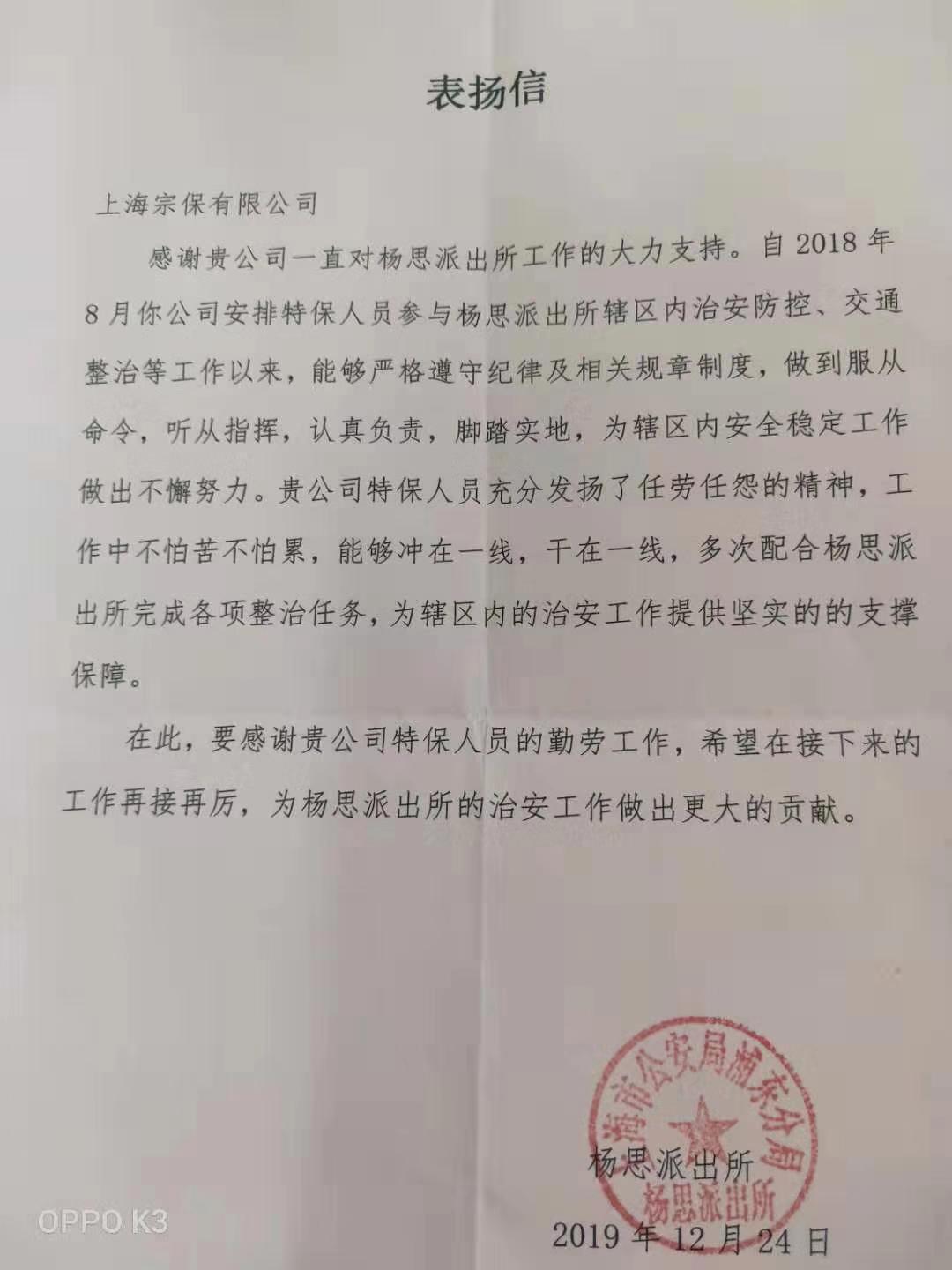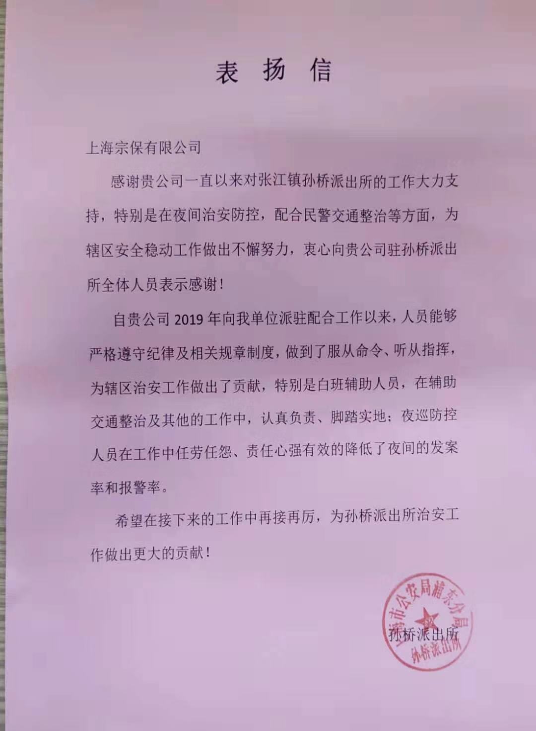 12月23日,上海宗保公司收到一封來(lái)自浦東公安分局孫橋派出所的表?yè)P(yáng)信,對(duì)公司駐該所輔警項(xiàng)目隊(duì)伍全年工作表示肯定和感謝,希望再接再厲,做出更大貢獻(xiàn)。