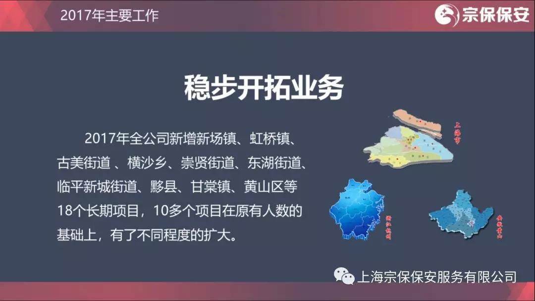 2017年全公司新增新場鎮(zhèn)、虹橋鎮(zhèn)、古美街道 、橫沙鄉(xiāng)、崇賢街道、東湖街道、臨平新城街道、黟縣、甘棠鎮(zhèn)、黃山區(qū)等18個長期項目,10多個項目在原有人數的基礎上,有了不同程度的擴大。2017年公司合同人數增加1000多人。這是公司連續(xù)第9年業(yè)績穩(wěn)步增長,年年邁大步、年年上臺階。公司人數的增加,不是簡單數量上的增長,而是一批批隊員的合格、一位位骨干的成熟、一個個項目的過硬。