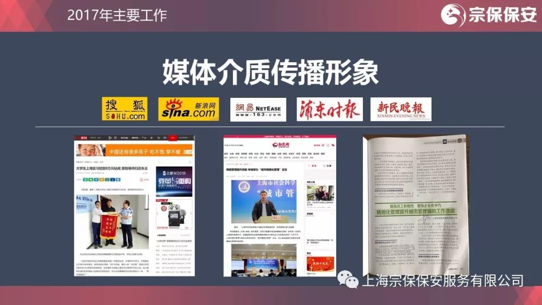 酒香不怕巷子深,由風做介質;好事照樣傳千里,靠媒體傳播。2017年,搜狐網、新浪網、網易、中國新聞網、《新民晚報》、《浦東日報》、《上海城管執(zhí)法》、《保安與技防》等多家媒體相繼報道公司的正面形象。媒體紛至而來,既是社會各界對宗保人踏實工作、文明值勤的認可,更是宗保企業(yè)文化這壇佳釀不斷發(fā)酵、香飄久遠所致。
