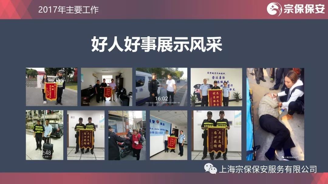 2017年8月9日,陸家嘴城管項目隊員馬立翔在工作過程中,撿到價值8萬多元的白金鉆戒,毫不猶豫交給民警找到失主一下子成為網紅小哥。馬立翔只是無數宗保好人的一個具體代表。2017年,全公司共交還遺失財物30多萬元,拒收賄賂20多萬元,找回走失兒童8人,400多人次打不還手、罵不還口,堅持文明值勤。“上崗提供服務,微笑增添力量,刁難接受考驗,忍辱造就和諧”的服務理念已經深深烙在每一名宗保人的心中。