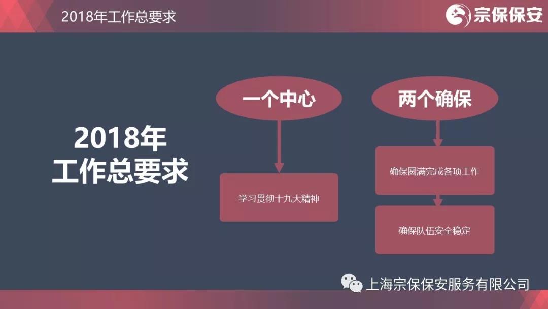激情和汗水成就過去,理性和堅強鑄就未來。2018年,公司總體要求是抓住一個中心,守住兩個確保。一個中心就是學習貫徹十九大精神。十九大報告指出,要不斷滿足人民日益增長的美好生活需要,習近平總書記在上海提出的“讓城市更有序、更安全、更干凈”,這都對我們的工作提出了新的更高的要求。兩個確保就是確保圓滿完成甲方交給的各項工作,確保隊伍安全穩(wěn)定。前者是使命所系、職責所在,沒有這個確保,公司和隊員就沒有存在的價值和作用;后者是根本保證和依托,沒有這個確保,一切工作都是空話,只能是水中月、鏡中花。