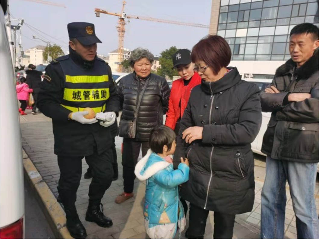 此時(shí),宗保公司駐周浦城管項(xiàng)目輔助人員王安斌在周市路關(guān)岳路的鎮(zhèn)黨建中心門口見到了這個(gè)驚慌失措的小姑娘。據(jù)王安斌回憶說,當(dāng)時(shí)正好是下午三時(shí)左右,黨建中心門口有一名四歲左右的女童獨(dú)自在馬路邊哭泣。王安斌見狀立即停止巡查,上前詢問情況。原來(lái),這個(gè)小姑娘和家里人走失了,說不清楚家庭地址和家人電話。王安斌立即將此情況上報(bào),并告知附近2公里的隊(duì)員注意街面巡查時(shí)有無(wú)尋找孩子的人員。半個(gè)小時(shí)后消息傳來(lái),周市路中大街附近,有個(gè)女子神色慌張,不停地在打電話聯(lián)系。隊(duì)員立即通知王安斌帶孩子前來(lái)。終于,走失的孩子找到了外婆,大人孩子破涕為笑。老夫妻對(duì)王安斌急群眾所急的善舉不停地表示謝意,并要買來(lái)香煙作為感謝。王安斌婉言謝絕,用他的話說:我只是做了我應(yīng)該做的,我雖然不是正式隊(duì)員,但我身上穿的衣服印有“城市管理”,我也有責(zé)任做好身邊的每一件事。