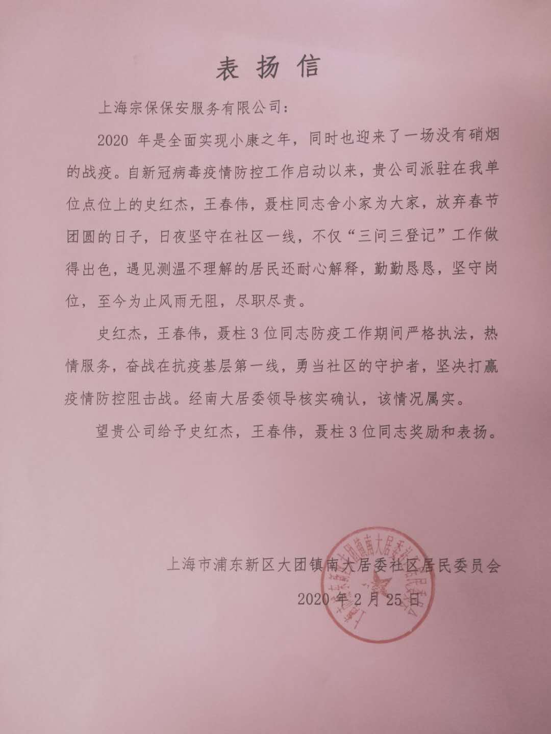 2月25日,宗保公司收到浦東新區(qū)大團鎮(zhèn)南大居委社區(qū)的表揚信,表揚公司駐大團項目的史紅杰、王春偉、聶柱三名隊員在疫情防控中的工作表現(xiàn)。