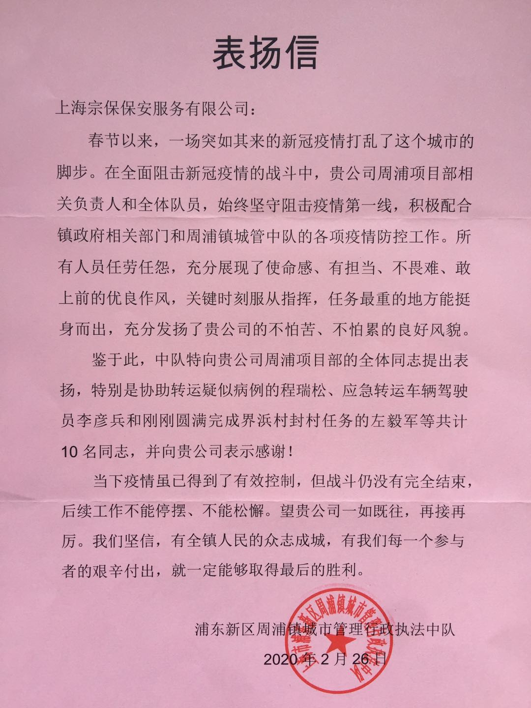 2月26日,浦東新區(qū)周浦鎮(zhèn)城管中隊送來表揚信,表揚公司駐周浦市容項目全體隊員在疫情防控中的工作表現(xiàn),特別對協(xié)助轉運疑似病例的程瑞松、應急轉運車輛駕駛員李彥兵、圓滿完成界浜村封村任務的左毅軍等10名隊員重點表揚。
