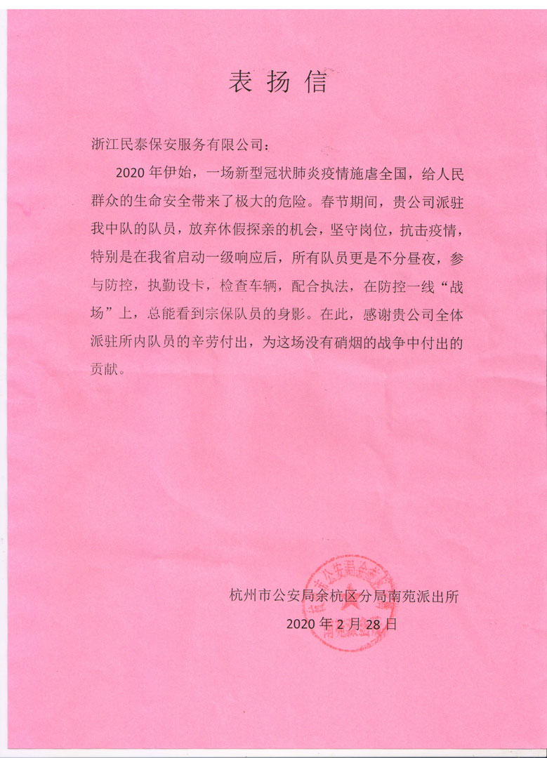 2月28日,浙江民泰公司收到杭州市公安局余杭區(qū)分局南苑派出所送來的表揚信,贊揚公司駐該所項目隊員在疫情防控中的工作表現(xiàn),感謝隊員們的辛勤付出。