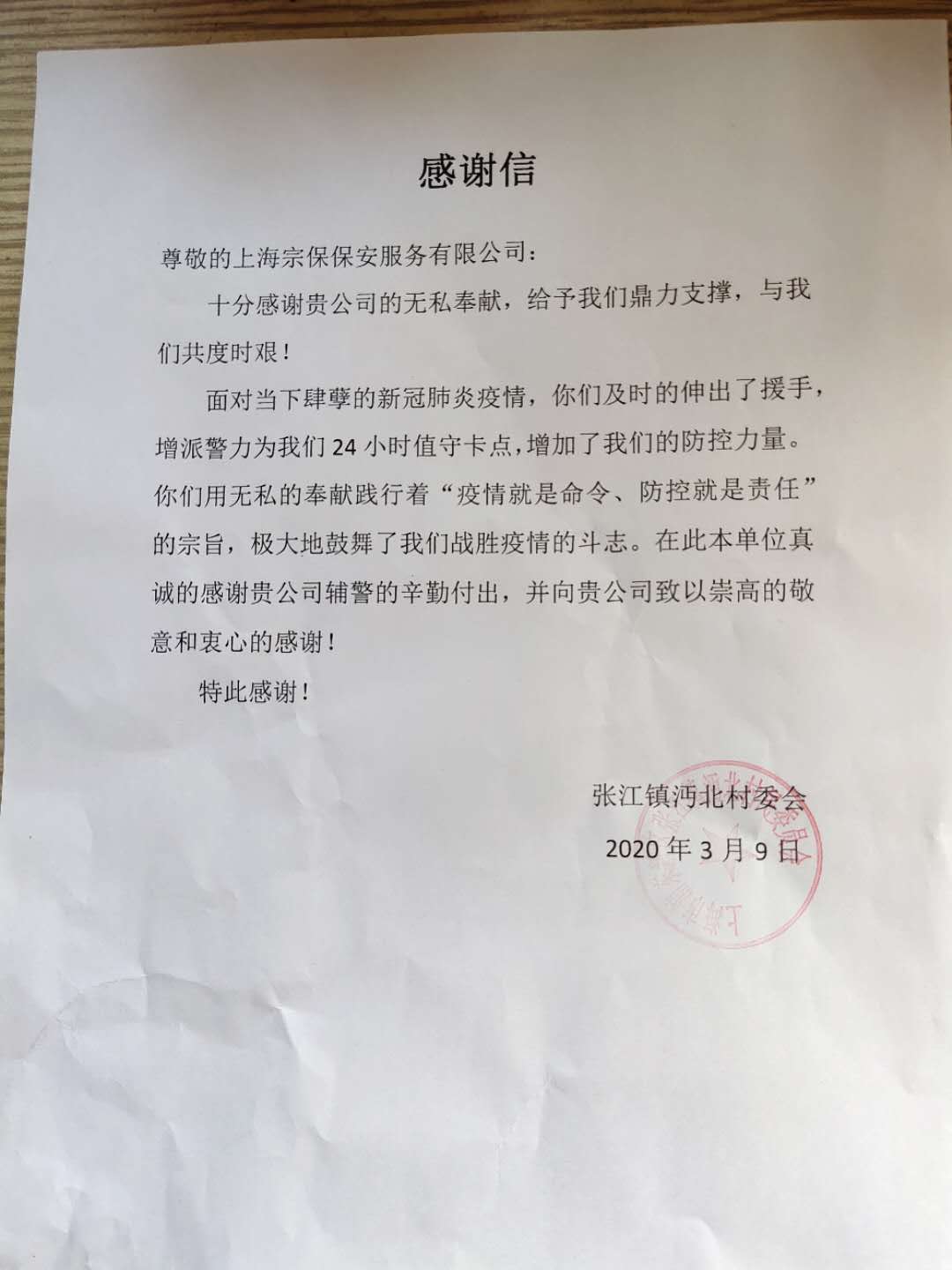 3月8日,張江鎮(zhèn)中心居委送來表揚信,表揚公司駐孫橋輔警項目全體隊員,感謝宗保公司在這次疫情防控中及時伸出援手,增派輔警力量值守固定崗位,增強防控力量。