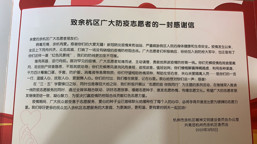 3月5日,宗保公司駐周浦市容項目收到周浦鎮(zhèn)瓦屑居委會送來的表揚信,表揚廢寢忘食、臨危不懼、晝夜奮戰(zhàn)在疫情防控一線的隊員。