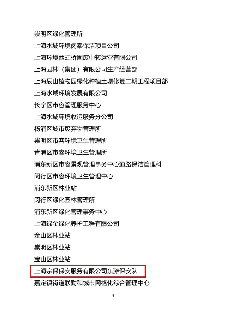 近日,上海市綠化和市容管理局下發(fā)了《關于表彰2019年度上海市綠化市容行業(yè)勞動立功競賽先進集體和先進個人的決定》,上海宗保保安服務有限公司東灘保安隊被授予“2019年度上海市綠化市容行業(yè)勞動立功競賽先進集體”榮譽稱號。