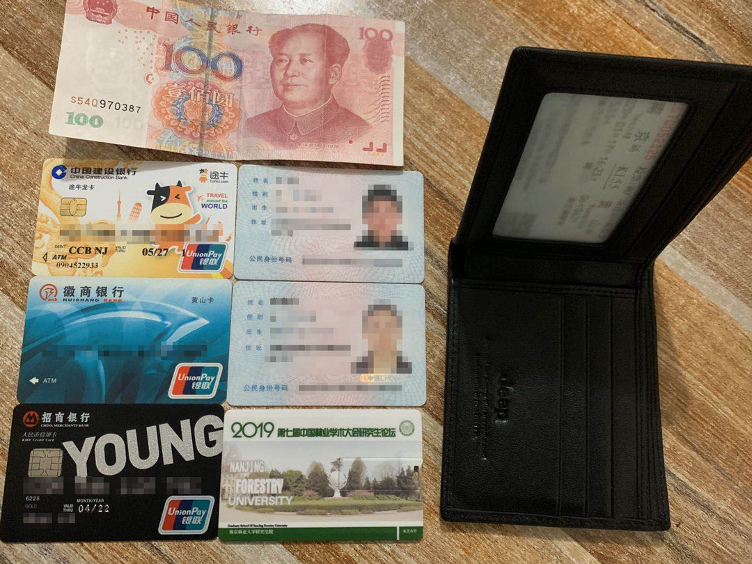 4月1號20:00,宗保公司駐黃山區(qū)域湯口市容項目隊員楊興智在湯口鎮(zhèn)沿溪東街巡邏時撿到一個錢包,內(nèi)有一百元現(xiàn)金一張、銀行卡三張、身份證兩張。