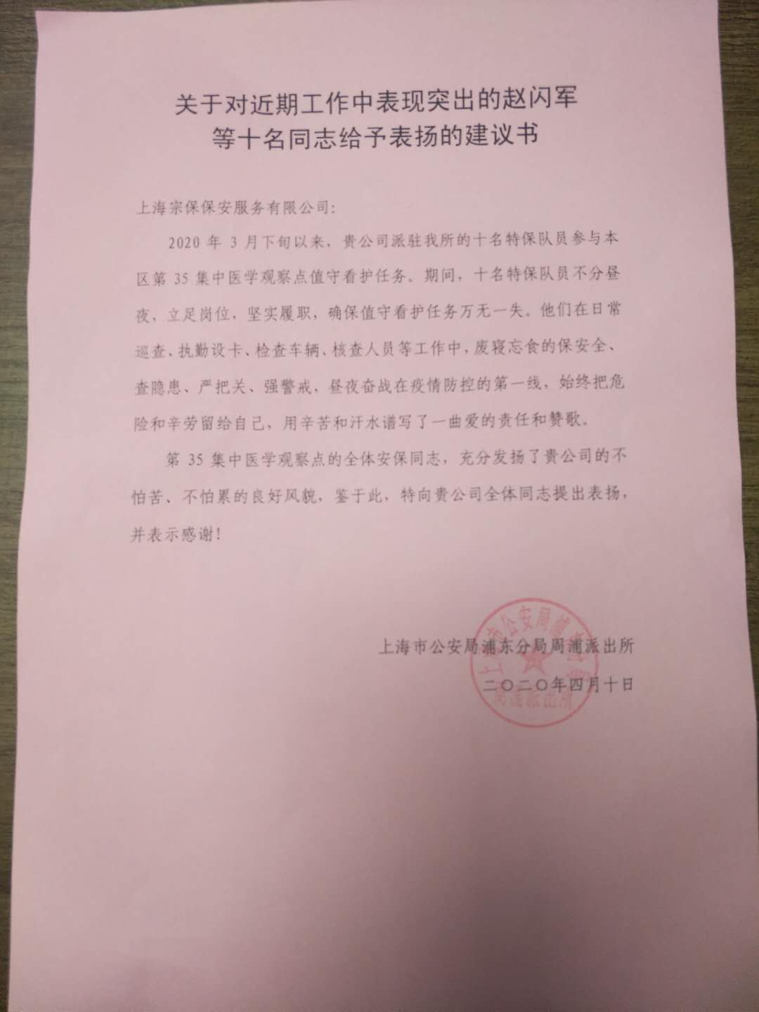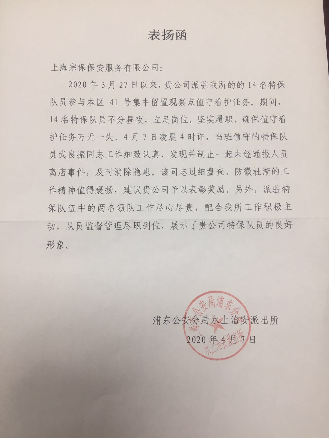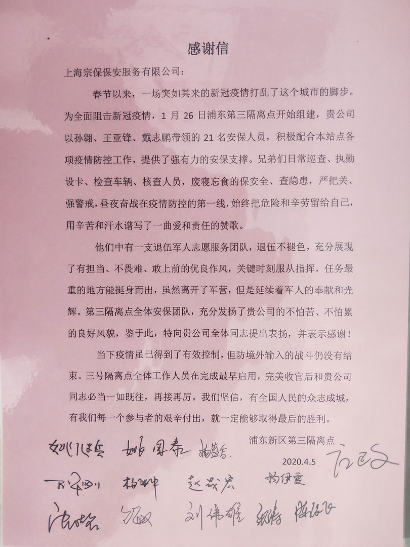 4月10日,宗保公司駐周浦輔警項目收到甲方的感謝信,信中對參與35號集中醫(yī)學觀察點的趙閃軍等10名保安員提出表揚并表示感謝。