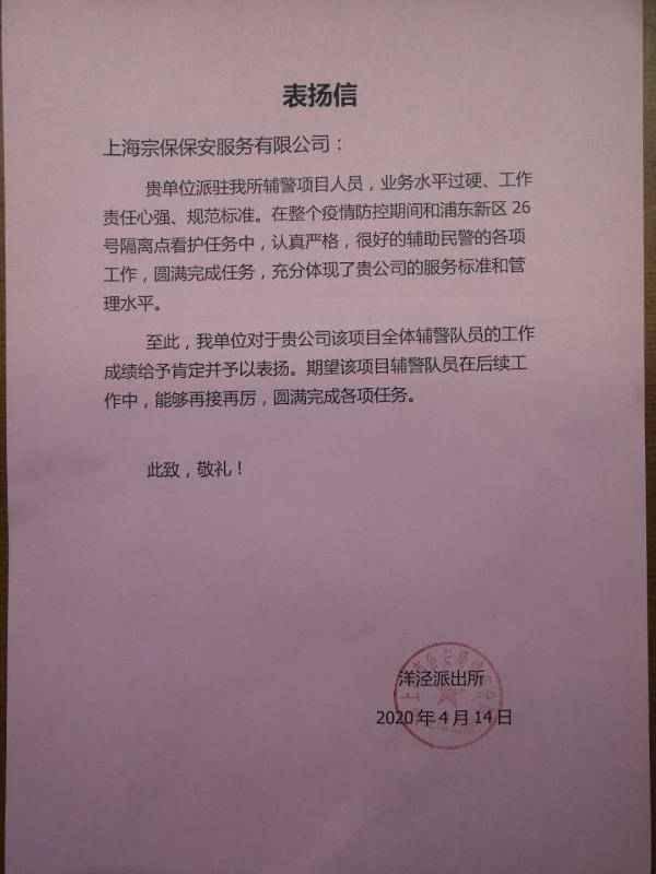 4月14日,宗保公司收到洋涇派出所送來的表揚信。信中對公司駐該所輔警項目參與第26號集中隔離點保障工作情況給予肯定和表揚。