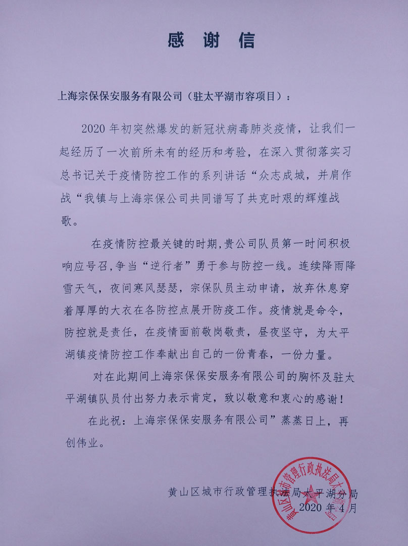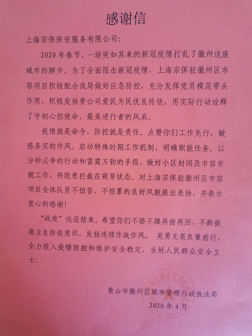 4月17日,宗保公司駐黃山徽州區(qū)市容項(xiàng)目收到黃山市徽州區(qū)城市管理行政執(zhí)法局的一封感謝信,信中對(duì)參與疫情防控的徽州區(qū)市容項(xiàng)目全體保安員提出表?yè)P(yáng),并表示感謝。