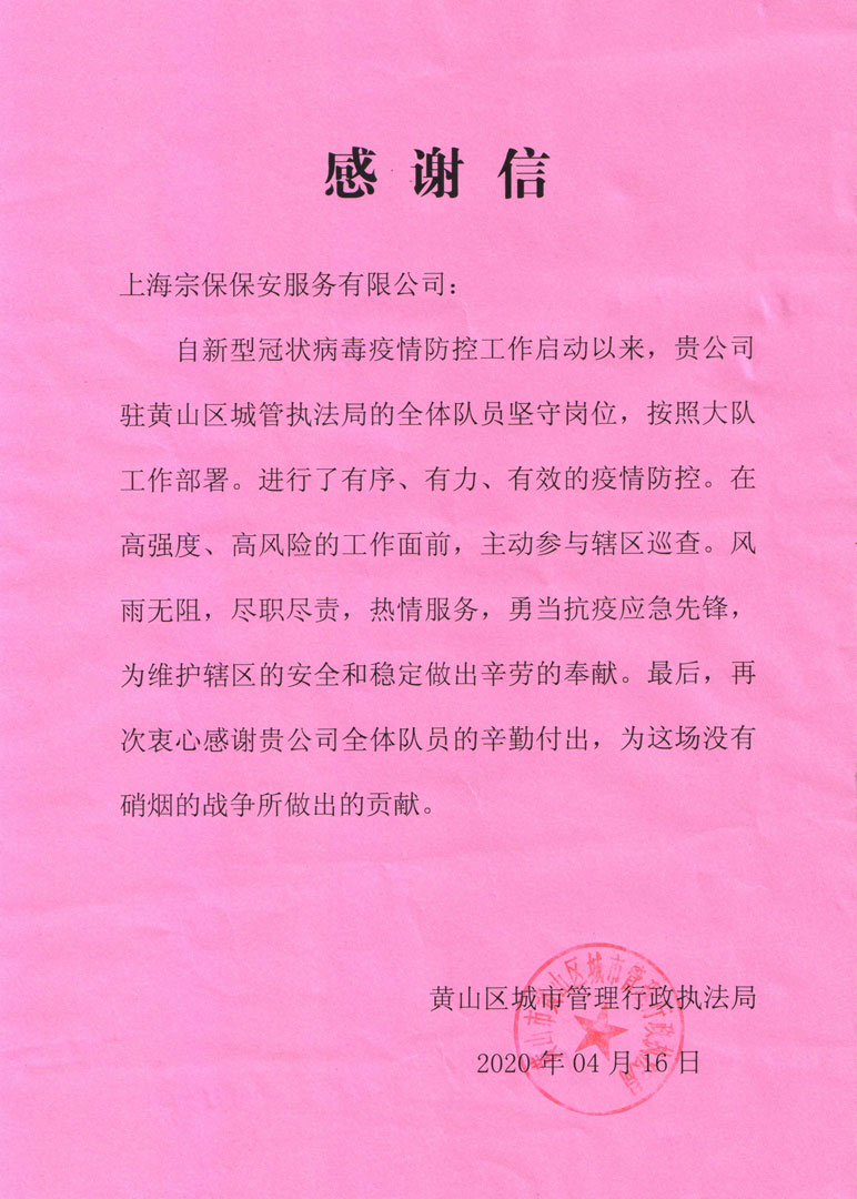 4月16日,宗保公司收到黃山區(qū)城市管理行政執(zhí)法局的一封感謝信,對(duì)在疫情防控期間付出辛勞的宗保隊(duì)員們表示肯定和感謝。