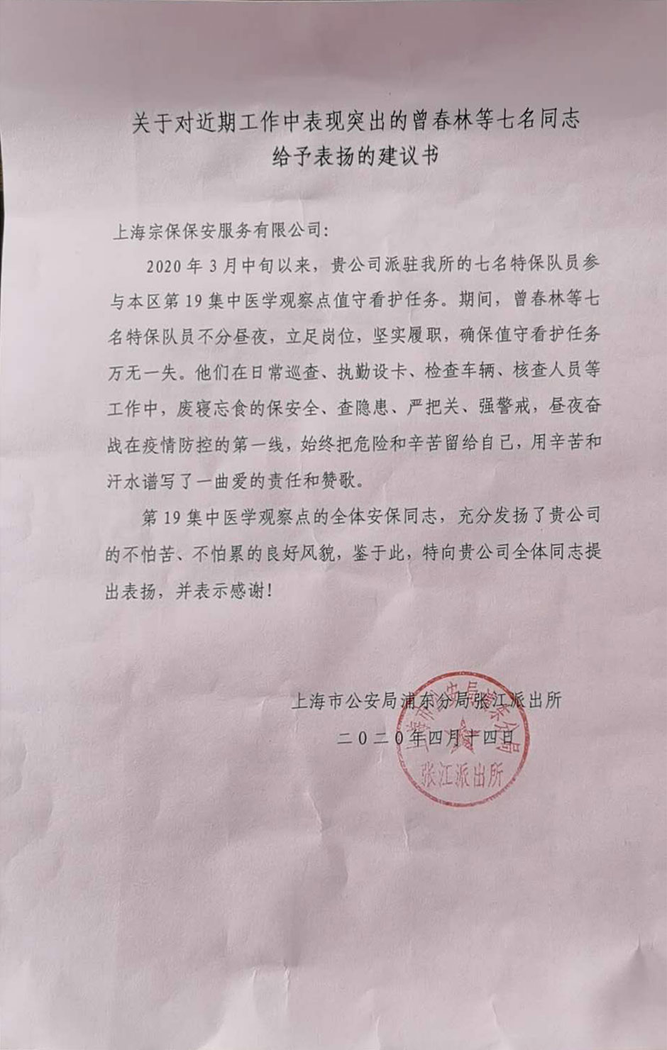 4月14日,宗保公司駐張江派出所輔警項(xiàng)目收到張江出所送來(lái)的一封表?yè)P(yáng)信,信中對(duì)該項(xiàng)目參與第19集中醫(yī)學(xué)觀察點(diǎn)值守看護(hù)任務(wù)的曾春林等宗保隊(duì)員提出表?yè)P(yáng)和感謝。