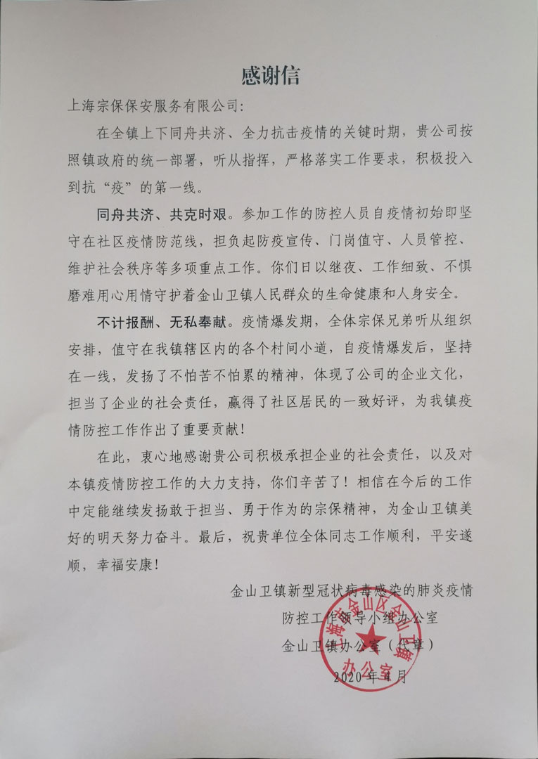 4月21日,宗保公司駐金山衛(wèi)鎮(zhèn)市容項(xiàng)目收到金山衛(wèi)鎮(zhèn)新冠疫情防控工作領(lǐng)導(dǎo)小組辦公室和金山衛(wèi)鎮(zhèn)辦公室聯(lián)合發(fā)來(lái)的一封感謝信,對(duì)在疫情防控期間付出辛勞的宗保隊(duì)員們表示肯定和感謝。