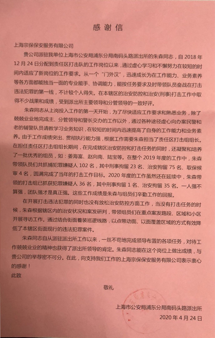 4月24日,宗保公司駐南碼頭派出所輔警項目收到浦東新區(qū)南碼頭派出所送來的感謝信,信中對該項目責任區(qū)打擊組組長朱森提出特別表揚。