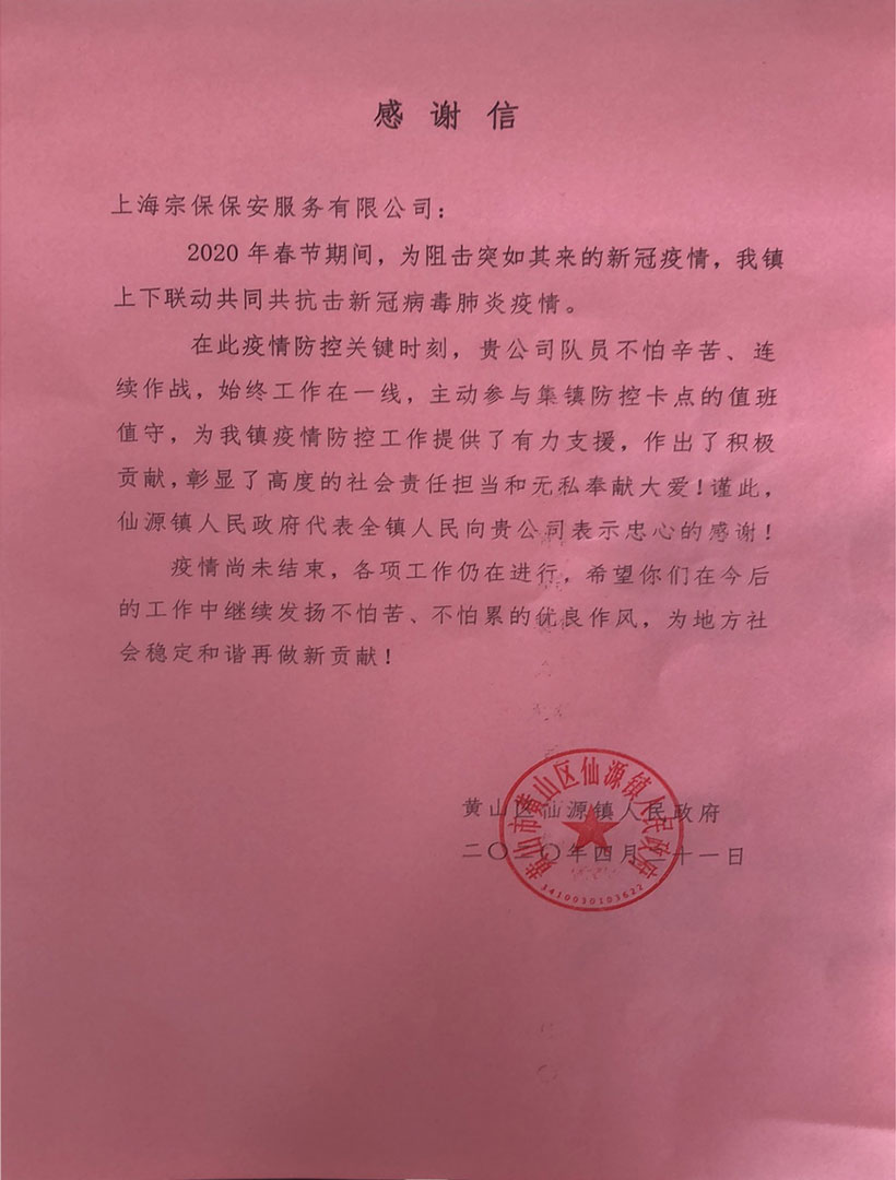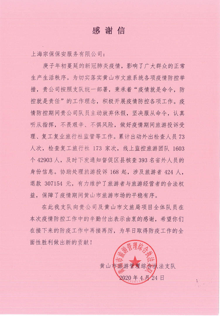 4月24日,宗保公司駐黃山市黟縣旅游管理綜合項目收到黟縣旅游管理綜合執(zhí)法局的一封感謝信,信中對公司全體隊員在疫情防控工作中的辛勤付出和敬業(yè)精神表示感謝。