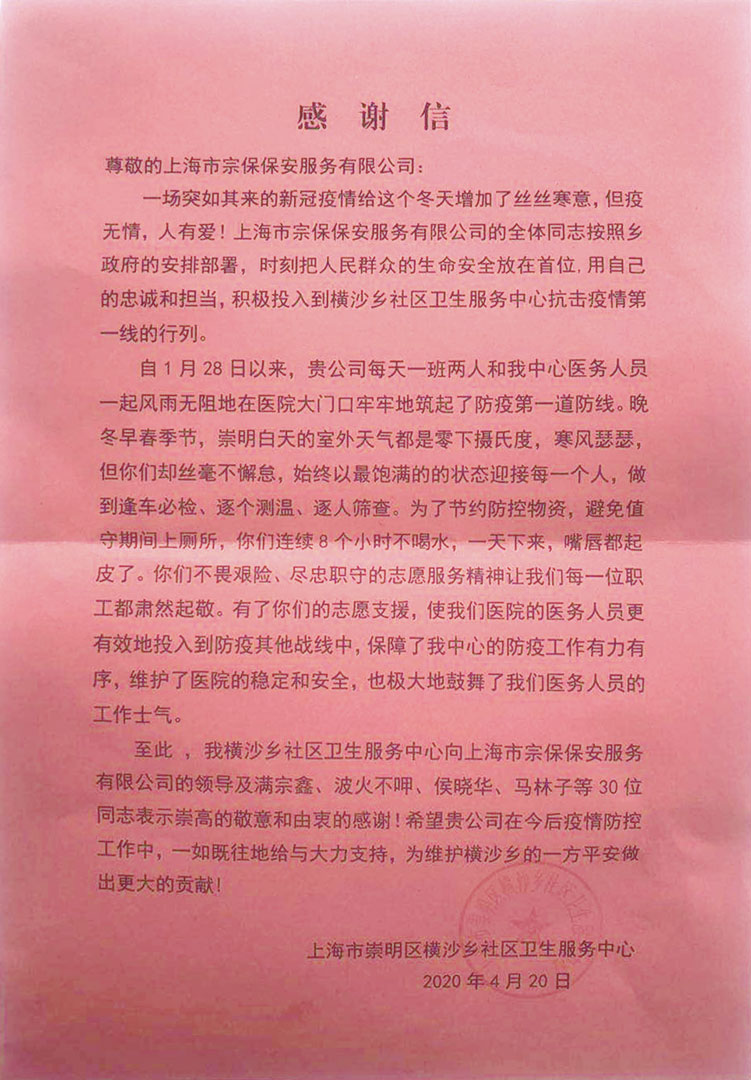 4月25日,宗保公司收到浦東新區(qū)張江鎮(zhèn)人民政府的感謝信。信中對宗保公司以善行擔起守望相助的社會責任,用義舉筑起抗擊疫情的家園情懷,表示感謝和敬意!