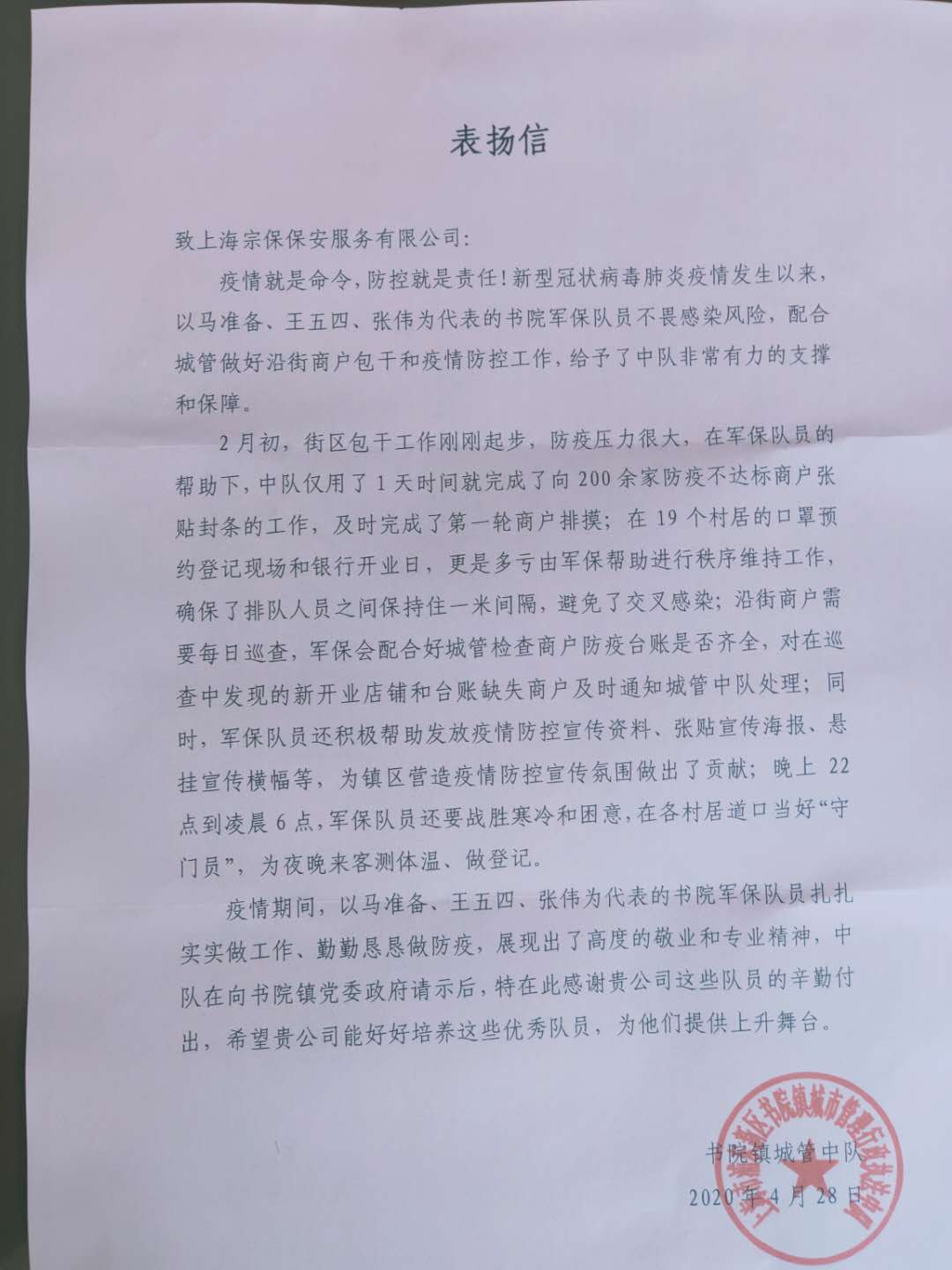 4月28日,宗保公司駐書院鎮(zhèn)市容項(xiàng)目收到書院鎮(zhèn)城管中隊(duì)中隊(duì)長(zhǎng)王燕偉送來(lái)的一封表?yè)P(yáng)信,信中對(duì)以馬準(zhǔn)備、王五四、張偉等為代表的書院鎮(zhèn)市容項(xiàng)目隊(duì)員,在防控新冠肺炎疫情中配合城管中隊(duì)所做的工作,提供的有力支撐和保障提出表?yè)P(yáng)。