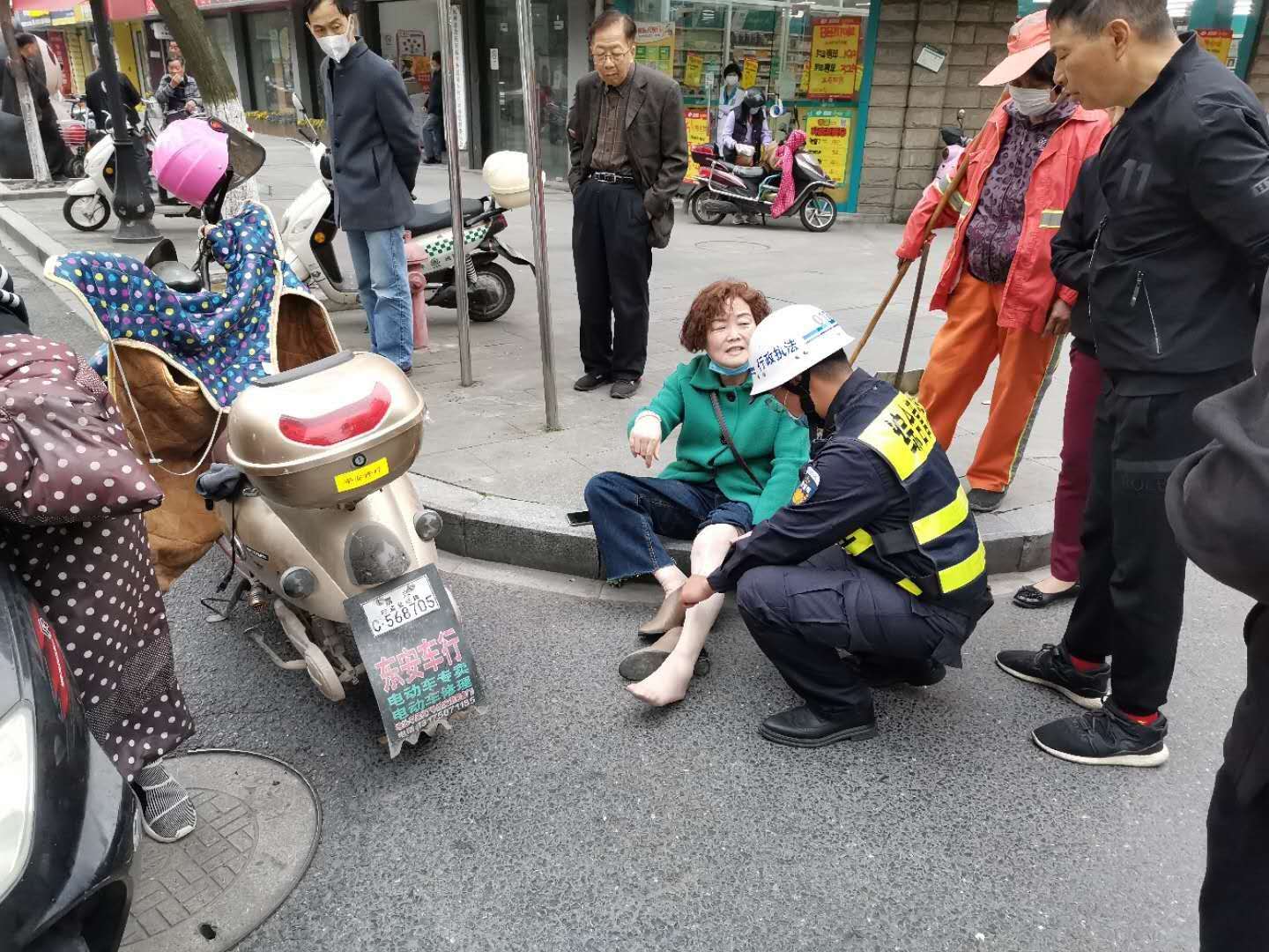 然而這一幕被巡邏至此的民泰公司駐臨平市容的保安員韓飛遇到。韓飛立即上前將阿姨扶到路邊坐下,發(fā)現(xiàn)阿姨的腿部關(guān)節(jié)受傷嚴(yán)重?zé)o法動彈,而阿姨已經(jīng)被嚇得一臉驚慌失措。韓飛一邊安撫阿姨,一邊打了110報(bào)警電話,然后和阿姨家人取得聯(lián)系。