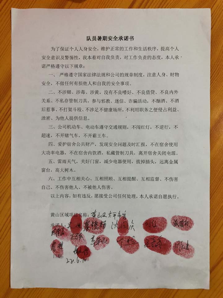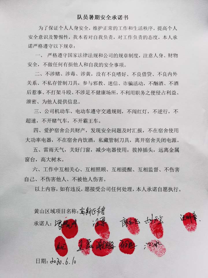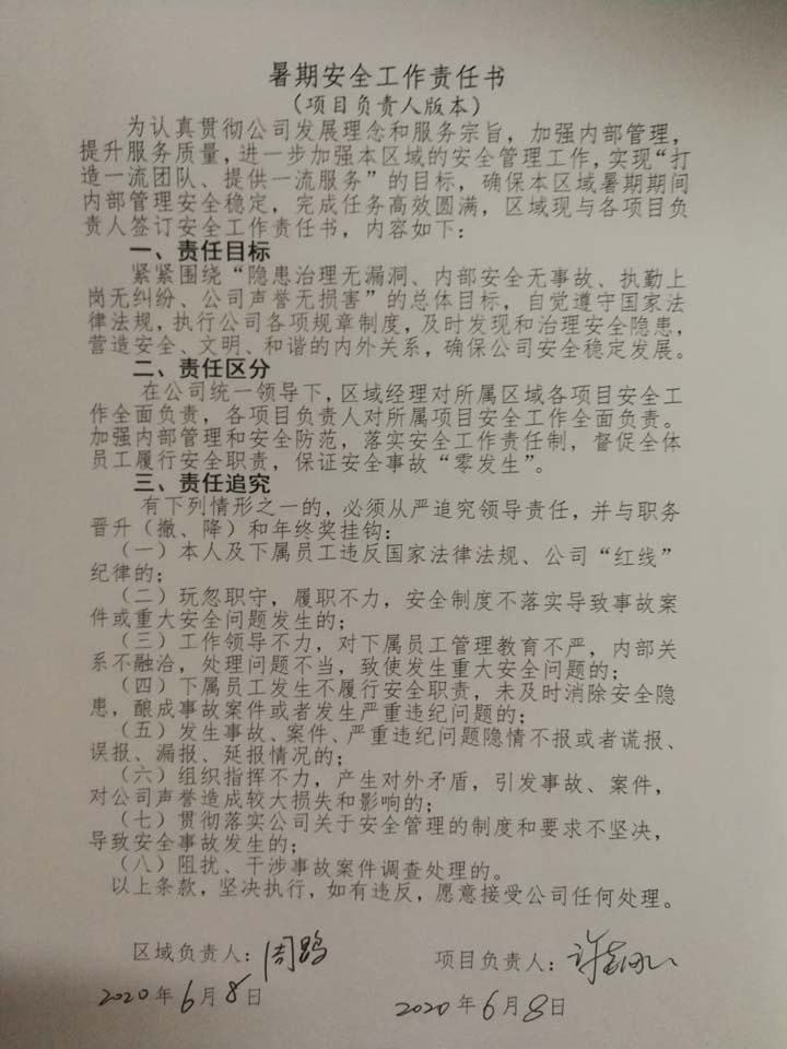 6月15日,閔行區(qū)域經(jīng)理周鹍組織召開本區(qū)域骨干安全工作會(huì)議,結(jié)合閔行區(qū)域的實(shí)際情況,制定安全工作實(shí)施方案,參照公司下發(fā)的“十查十防”一覽表進(jìn)行自查自糾,逐項(xiàng)梳理、查漏補(bǔ)缺。對(duì)本項(xiàng)目自身難以解決的安全隱患,及時(shí)上報(bào)區(qū)域經(jīng)理,并與每位隊(duì)員簽訂安全防范責(zé)任書,切實(shí)提高所有隊(duì)員的安全防范意識(shí)。