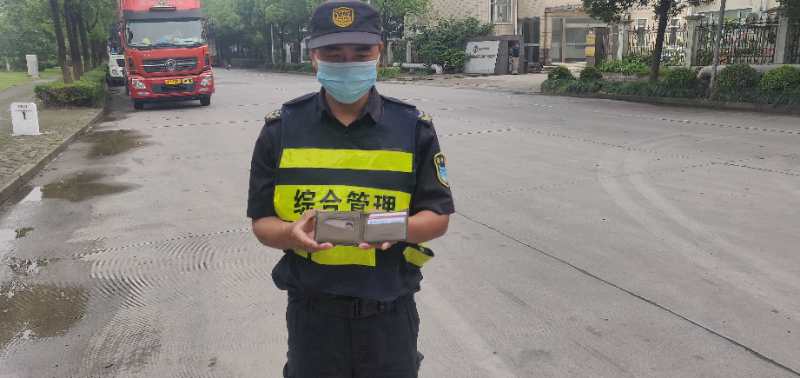 6月24日6:30,宗保公司駐高行市容項(xiàng)目駕駛員崔雷雷巡查至衡安路598號(hào)附近時(shí),發(fā)現(xiàn)馬路邊有一黑色錢包。小崔停好車撿起錢包,內(nèi)裝有少量現(xiàn)金、身份證、銀行卡、各類證卡、行程單據(jù)等。清點(diǎn)錢包內(nèi)物品時(shí),小崔打開執(zhí)法記錄儀進(jìn)行了全程記錄。
