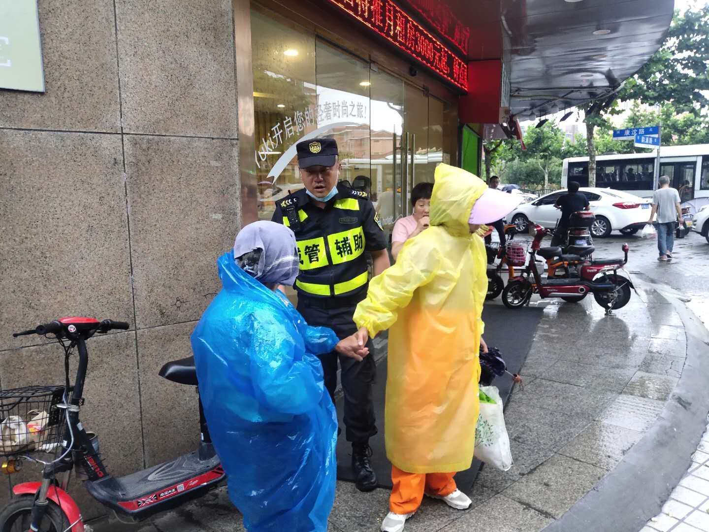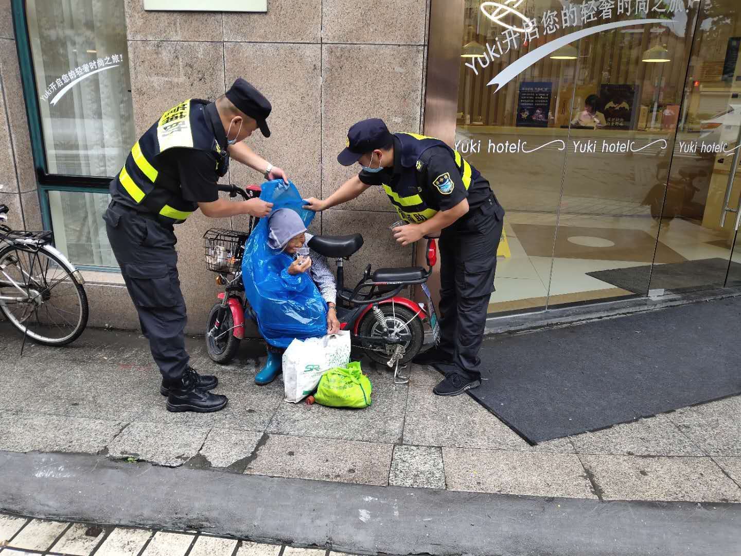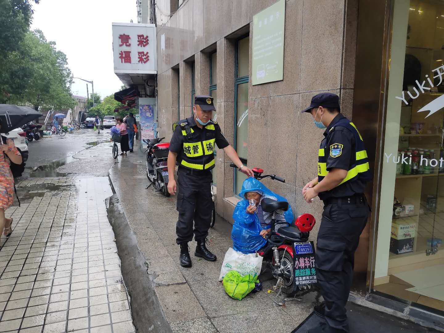 6月29日,宗保公司駐周浦市容項(xiàng)目三組隊員王明明,巡邏至湯家木橋西側(cè)時,看到一位老人瑟瑟發(fā)抖,蜷縮在勇丞酒店外墻邊。剛下過一場雨,老人沒帶任何雨具,只帶著頭巾,衣服幾乎濕透。這里離菜場很近,過往的人行色匆匆,沒有人多看老人一眼。