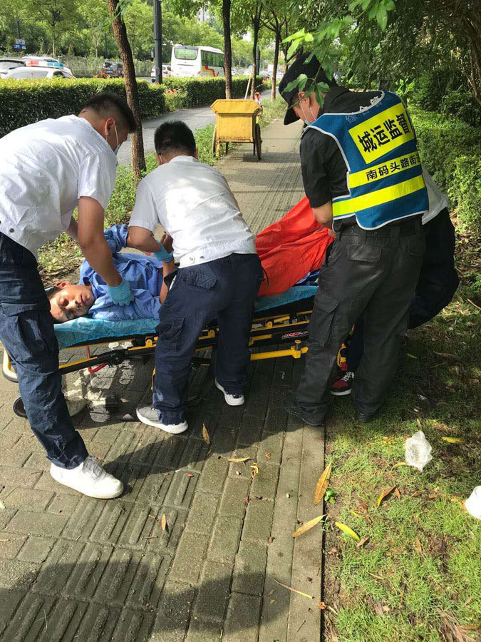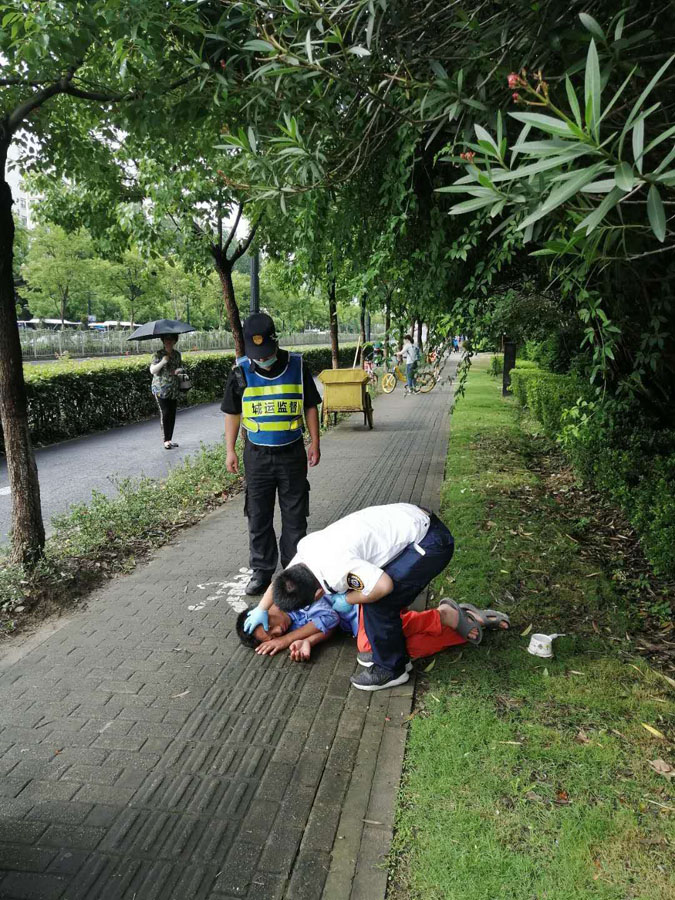 7月3日8:30,宗保公司駐南碼頭網(wǎng)格項(xiàng)目隊(duì)員宋文松巡邏至楊高南路西側(cè)東三里橋路時,發(fā)現(xiàn)往南約10米處的人行道上躺著一名男子。小宋立即上前查看,該男子年齡大約在45歲左右,跟他對話無任何反應(yīng)。