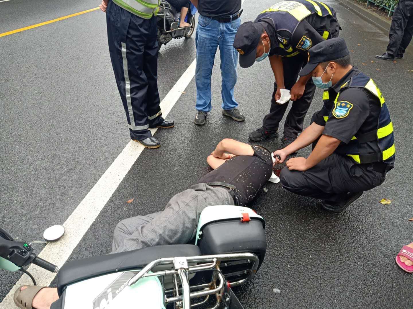 7月16日9:30,宗保公司駐高橋市容項目隊員李旭龍、徐金雷、萬少杰巡邏至草高支路和龍路交叉口時,遇到一名騎電瓶車的男子躺在馬路中間,電瓶車摔倒在一旁,因頭部著地失血過多,已處于昏迷狀態(tài)。