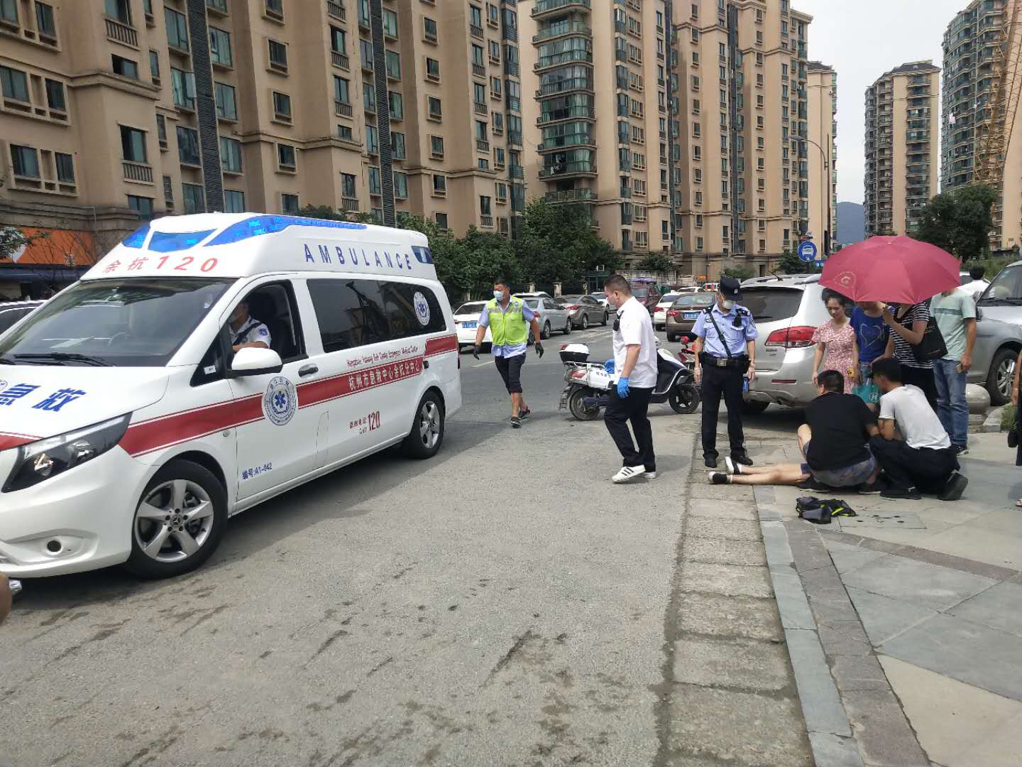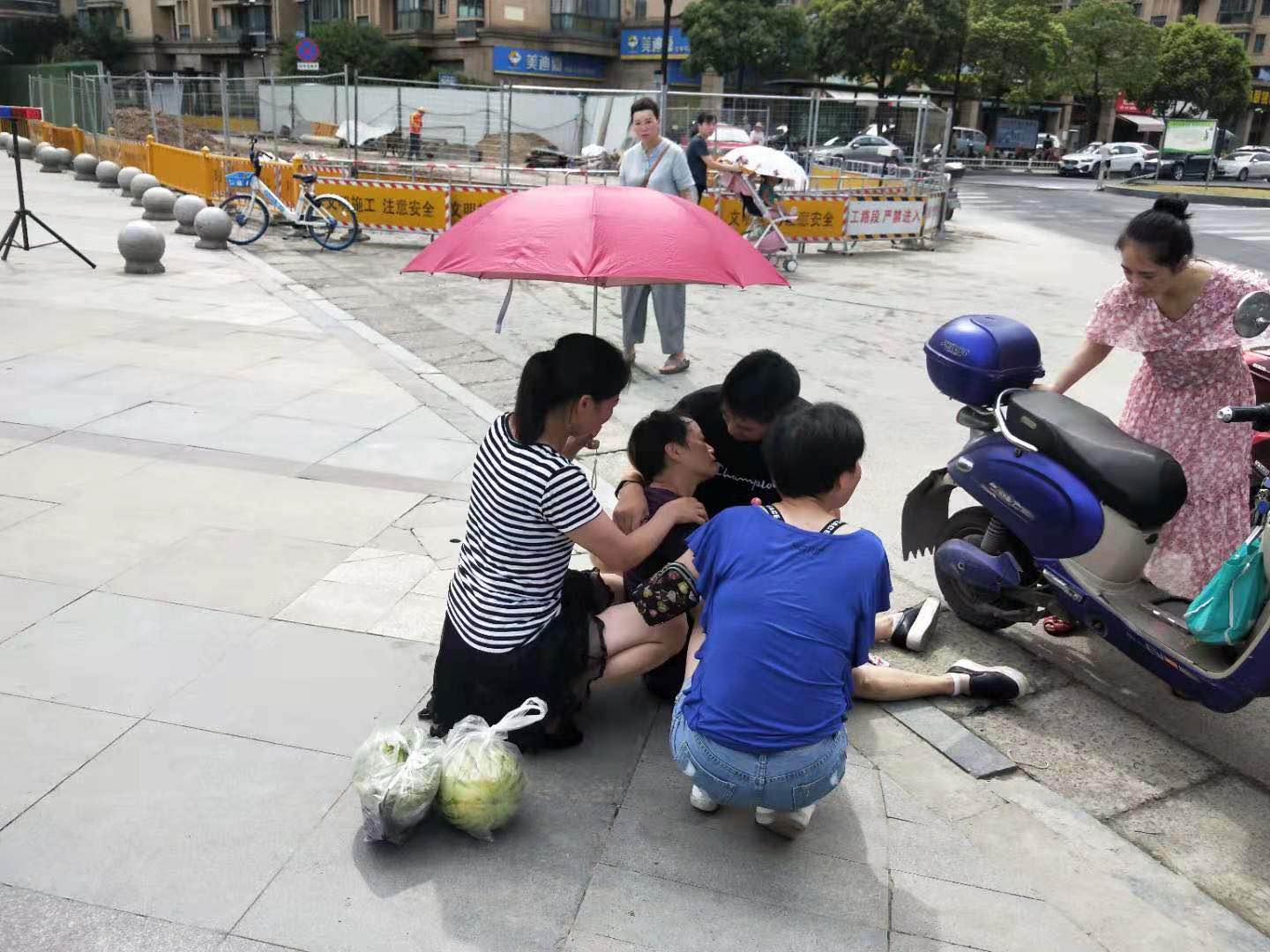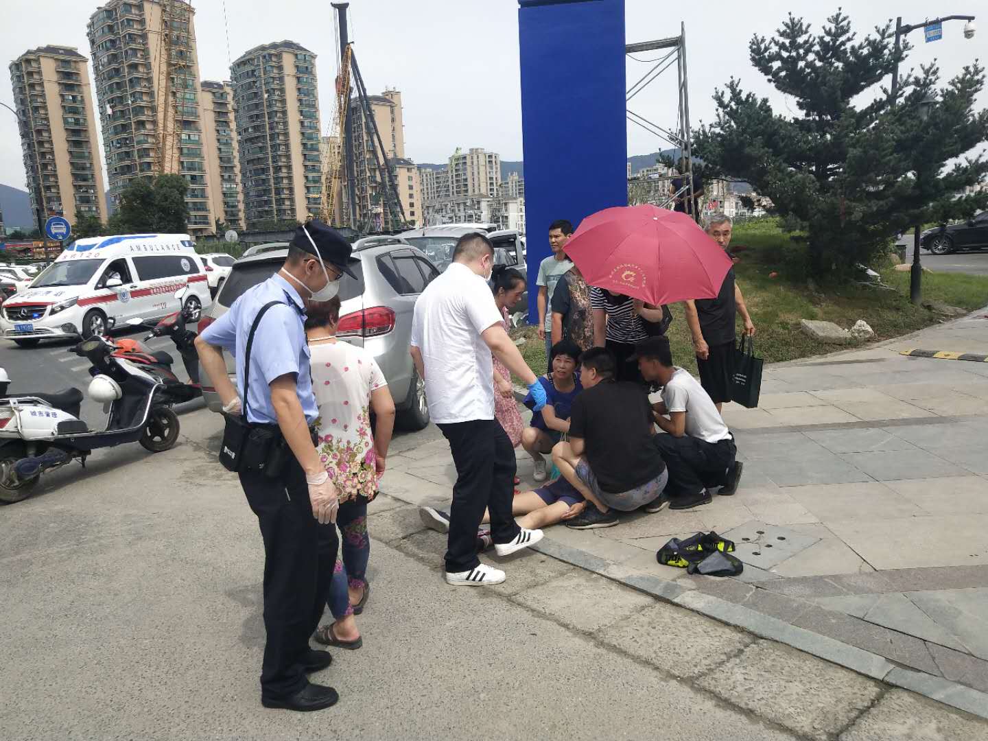 當(dāng)天,浙江民泰駐星橋市容項(xiàng)目隊(duì)員向榮在場環(huán)路上正常巡邏,遠(yuǎn)遠(yuǎn)看到前面圍著一群人。憑著多年的工作經(jīng)驗(yàn),向榮覺得前面一定是出事了,就急忙跑了過去。一名中年女子癱倒在地,圍觀的群眾議論紛紛。向榮立即上前詢問狀況,該女子家屬說是由于低血糖再加上天氣炎熱導(dǎo)致中暑,家屬瞬間也慌了神沒了主張。