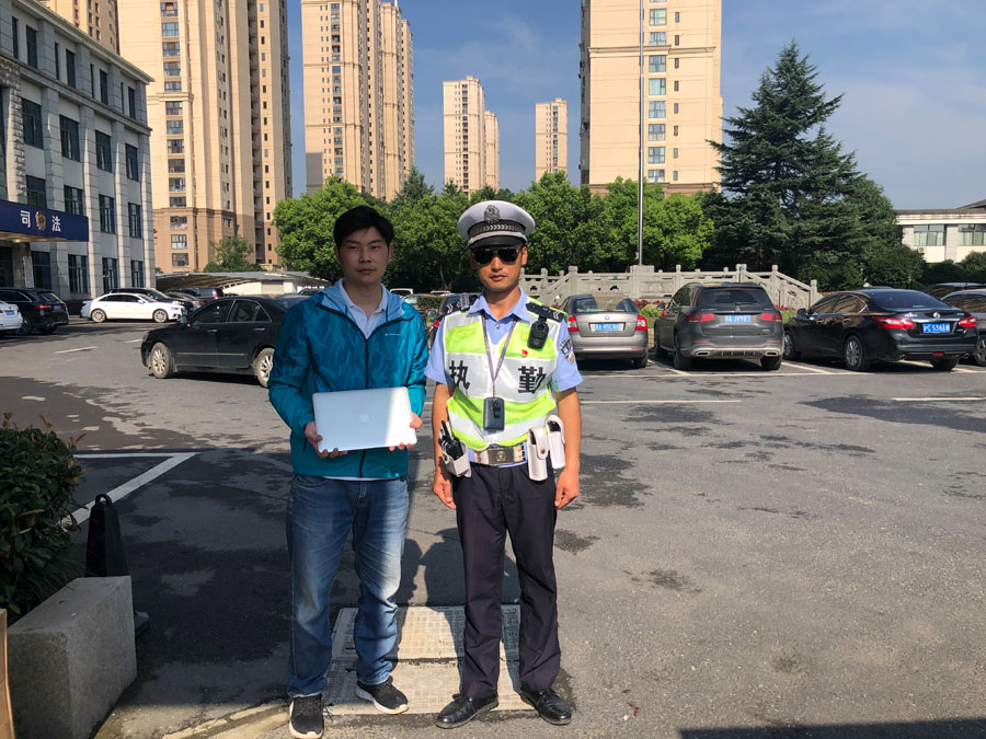 于是,張龍把背包就近放置在閑林街道辦事處保安室門衛(wèi)處,并向工作人員說明情況,然后繼續(xù)執(zhí)勤等待失主回來找尋。大概在8:30早高峰即將換崗的時候,一位穿藍色外套的男士急匆匆地趕過來,詢問張龍和李丹是否撿到一個裝有蘋果電腦的包。張龍將失主帶到門衛(wèi)處認領,經(jīng)核對穿藍色外套的男士確實是失主本人后,就把包內(nèi)電腦及其他貴重物品原封不動地交還了失主。