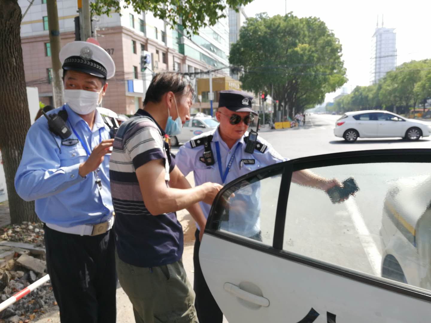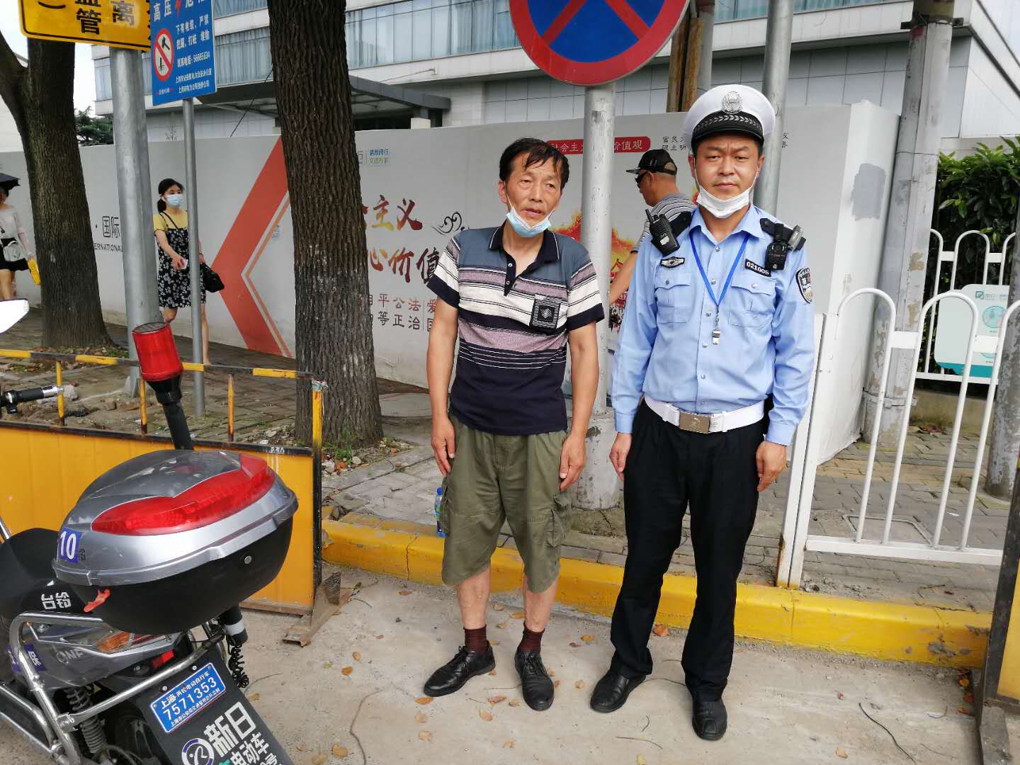 7月23日8:38,虹橋交警輔助項(xiàng)目機(jī)動(dòng)巡邏組隊(duì)員王學(xué)峰、朱偉偉在宜山路萬(wàn)源路路口巡邏時(shí),遇到一名失憶老人求助。