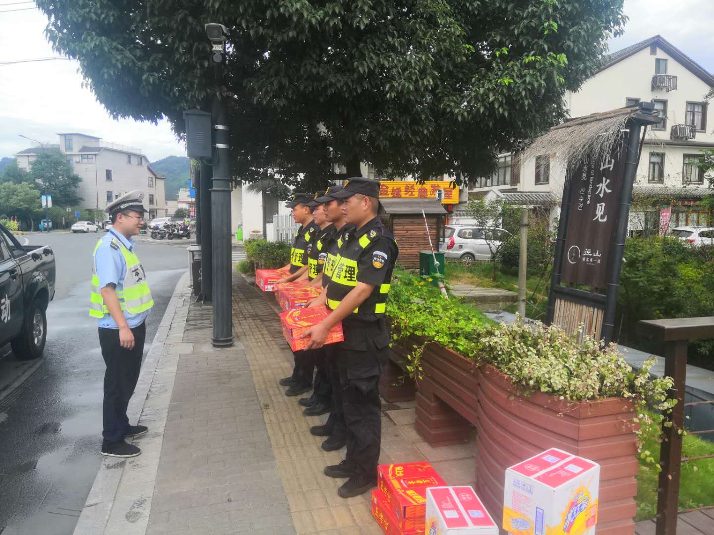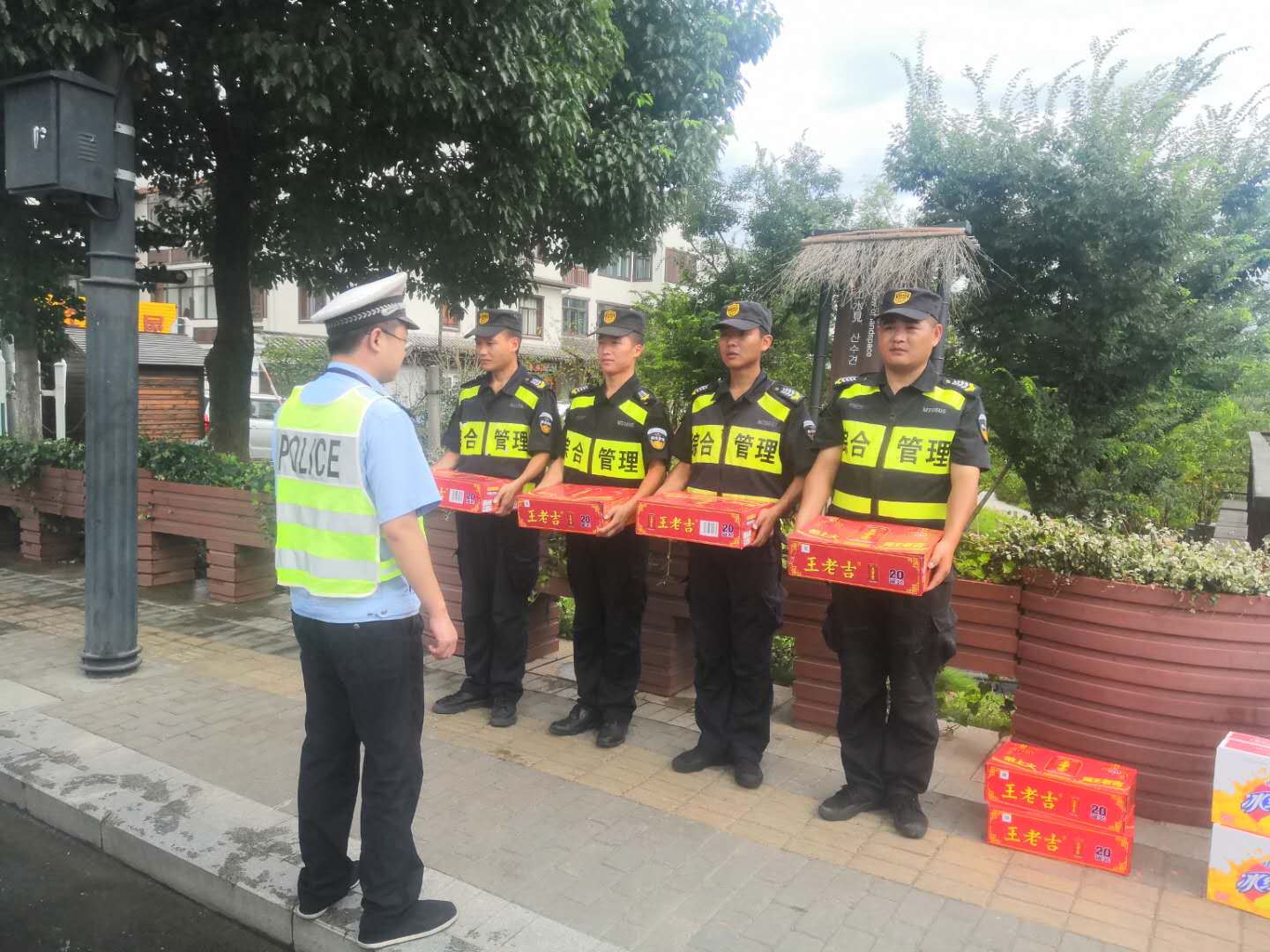 8月6日,烈日當(dāng)頭,驕陽(yáng)似火,大聯(lián)動(dòng)隊(duì)長(zhǎng)朱佳豪代表甲方領(lǐng)導(dǎo)對(duì)公司駐徑山市容項(xiàng)目一線隊(duì)員進(jìn)行慰問(wèn),贈(zèng)送防暑降溫用品。