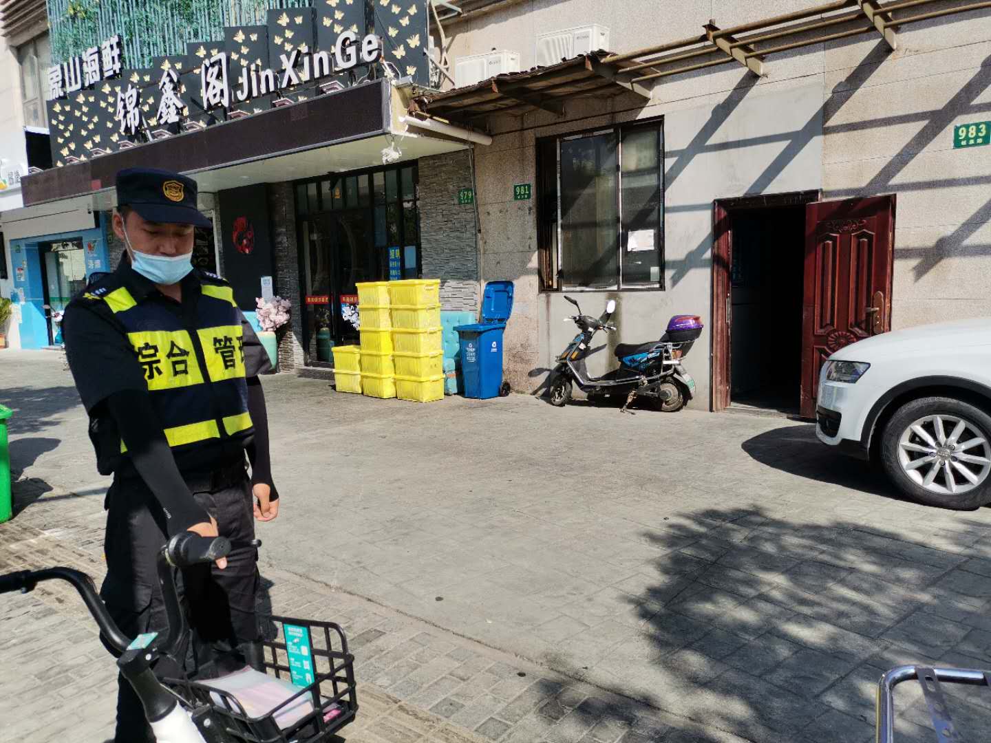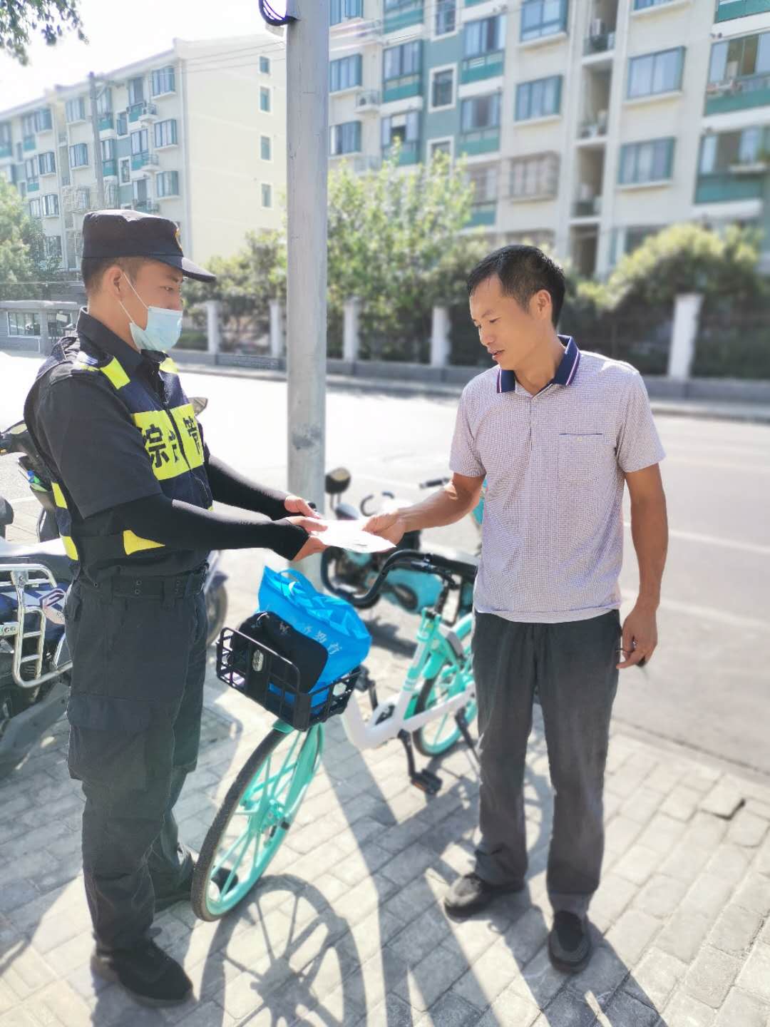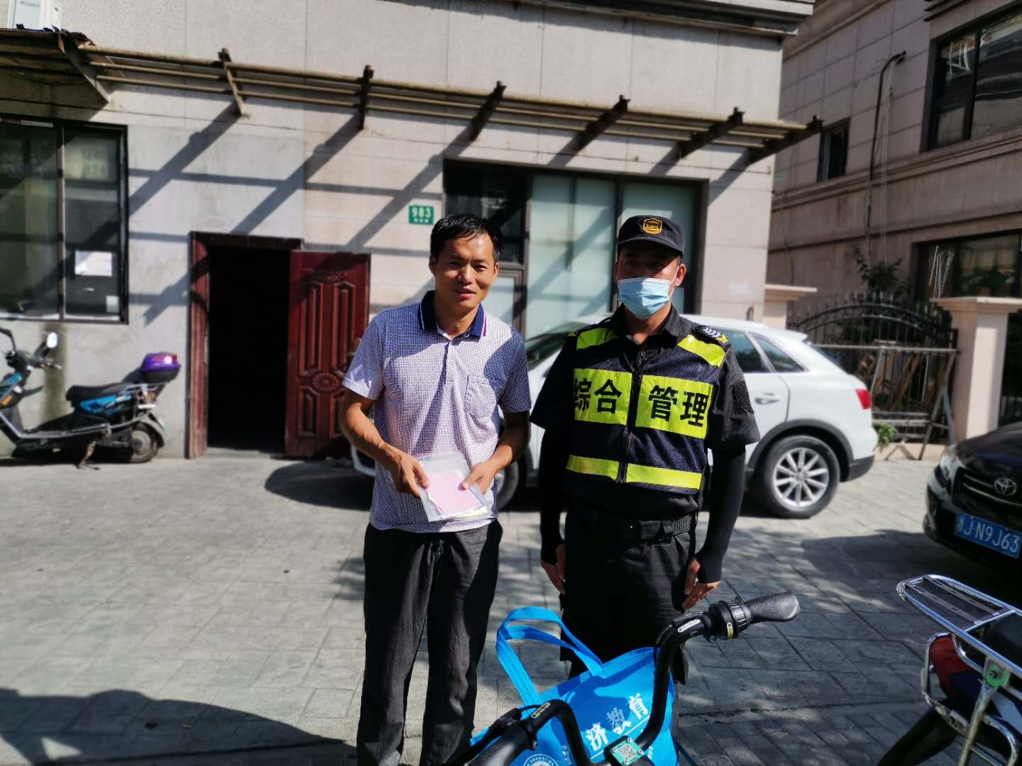 8月20日9:00左右,宗保公司駐三林城管輔助隊(duì)員李斌在板泉路980號(hào)門口整理共享單車時(shí),發(fā)現(xiàn)一輛車籃子里放著一個(gè)文件袋,里面裝有一份購(gòu)車合同、身份證、銀行卡和房門鑰匙等物品。