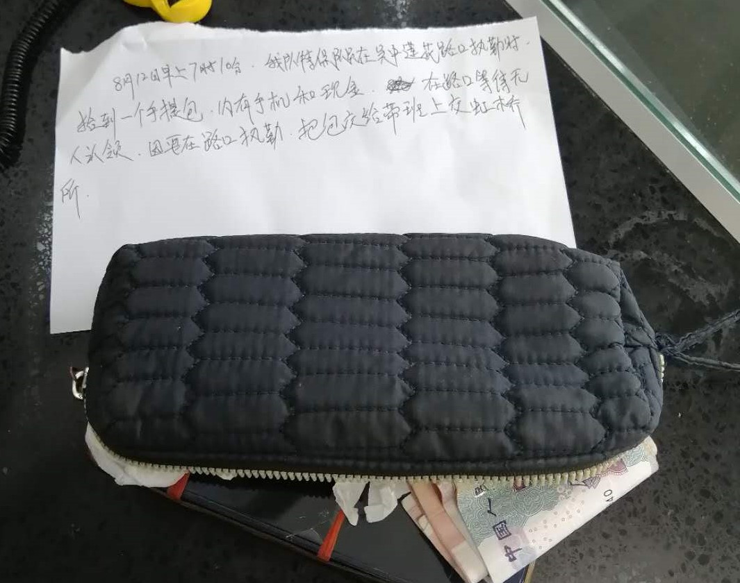 8月12日7:10,宗保公司駐閔行交通輔警項(xiàng)目隊(duì)員范成剛,在吳中路蓮花路路口執(zhí)勤時(shí)撿到一個(gè)手包,包內(nèi)有手機(jī)、現(xiàn)金等物品。