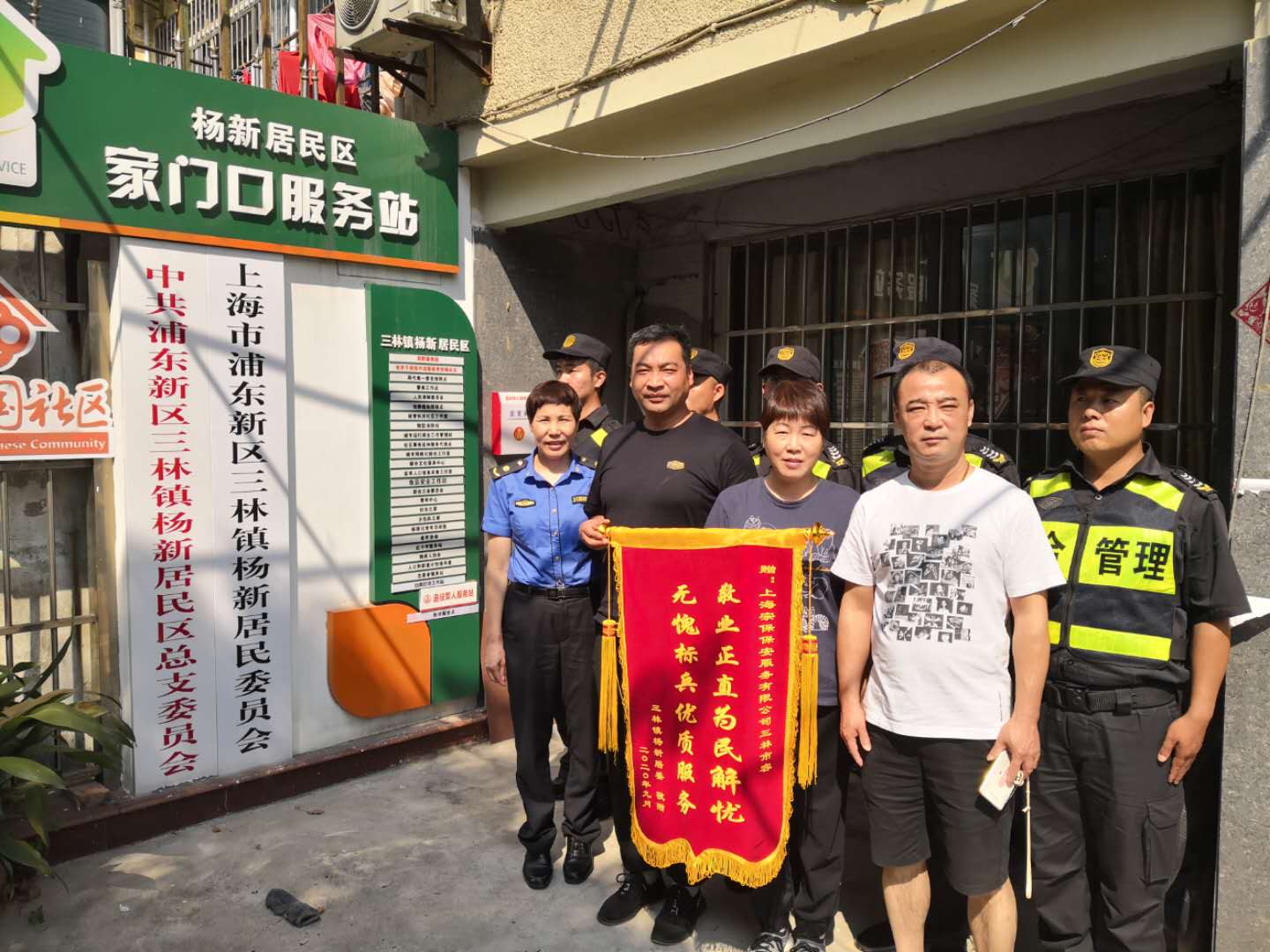9月8日10:00,三林鎮(zhèn)楊新居委書記欒其民、主任郎世瑾和三林鎮(zhèn)城管中隊領(lǐng)導(dǎo),向宗保公司駐三林市容項目隊員贈送一面繡有“敬業(yè)正直為民解憂,無愧標(biāo)兵優(yōu)質(zhì)服務(wù)”的錦旗。