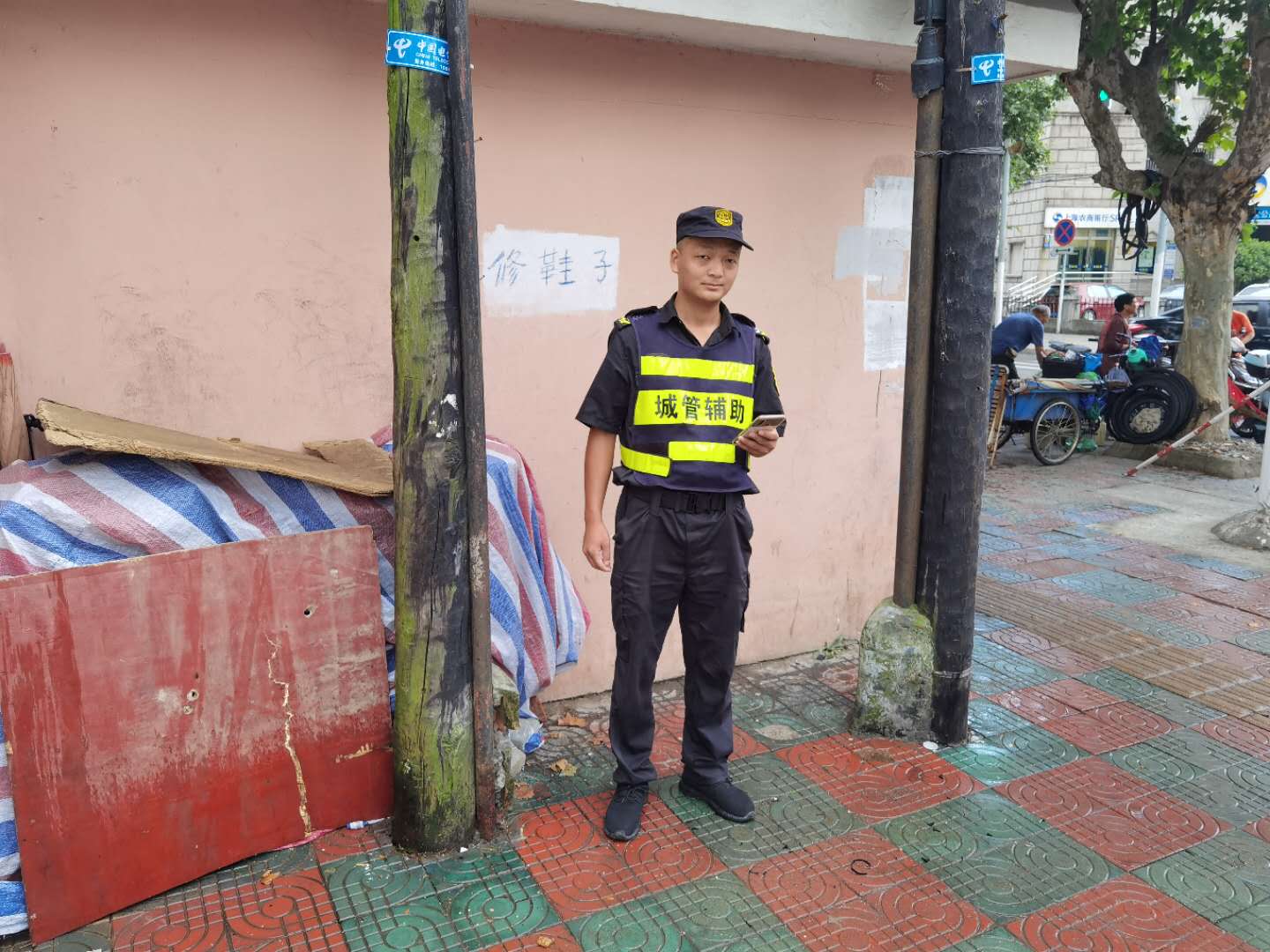 6:30左右,夜里剛下過雨,地上還有些濕。尹釗巡邏到一個路口發(fā)現(xiàn)有一部黑色手機(jī),想到失主丟失后會著急前來尋找,于是就在原地等待。