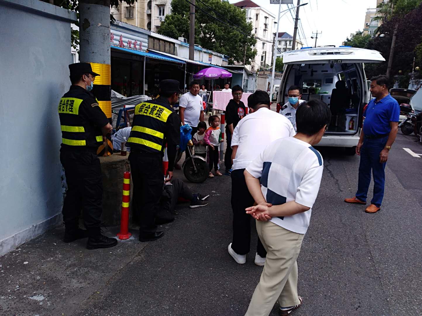 當日14:50,城管輔助隊員張銀在上浜路聯(lián)豐中心路口巡邏時,發(fā)現向南20米處有一位老人暈倒在地。張銀來不及多想,便立即將老人扶坐起來靠在電線桿上,并聯(lián)系附近巡邏員初紅雨幫忙救人。