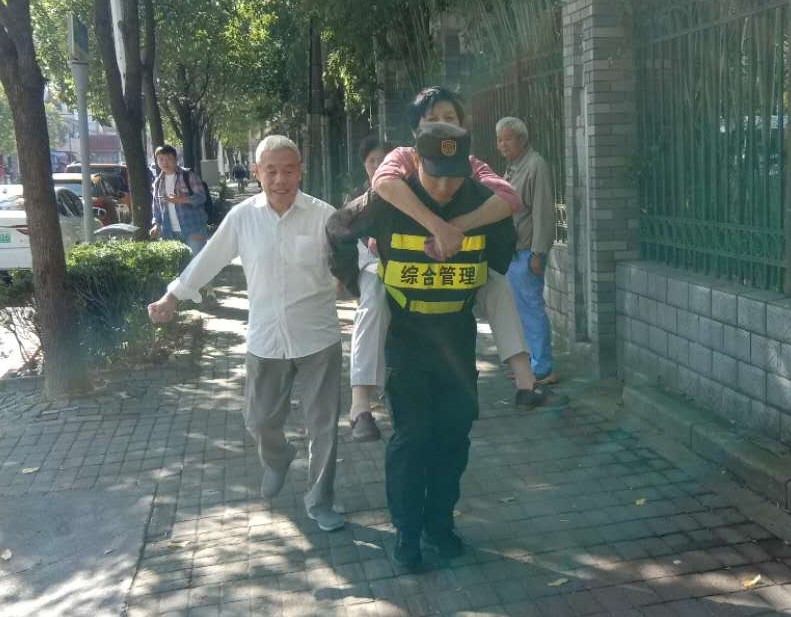 經(jīng)溝通了解到,老太太摔倒導(dǎo)致腳踝以及腰部受傷無法行走,攙扶老太太的老伴也一同摔倒,手臂也受傷了。隊員詢問老人是否需要120救護,老人家表示不需要,想先回家讓家里人陪同去醫(yī)院。因老人無法行走,隊員果斷將老人背起送到所住小區(qū),并在其單元樓門口等到家屬到來,才放心離開。