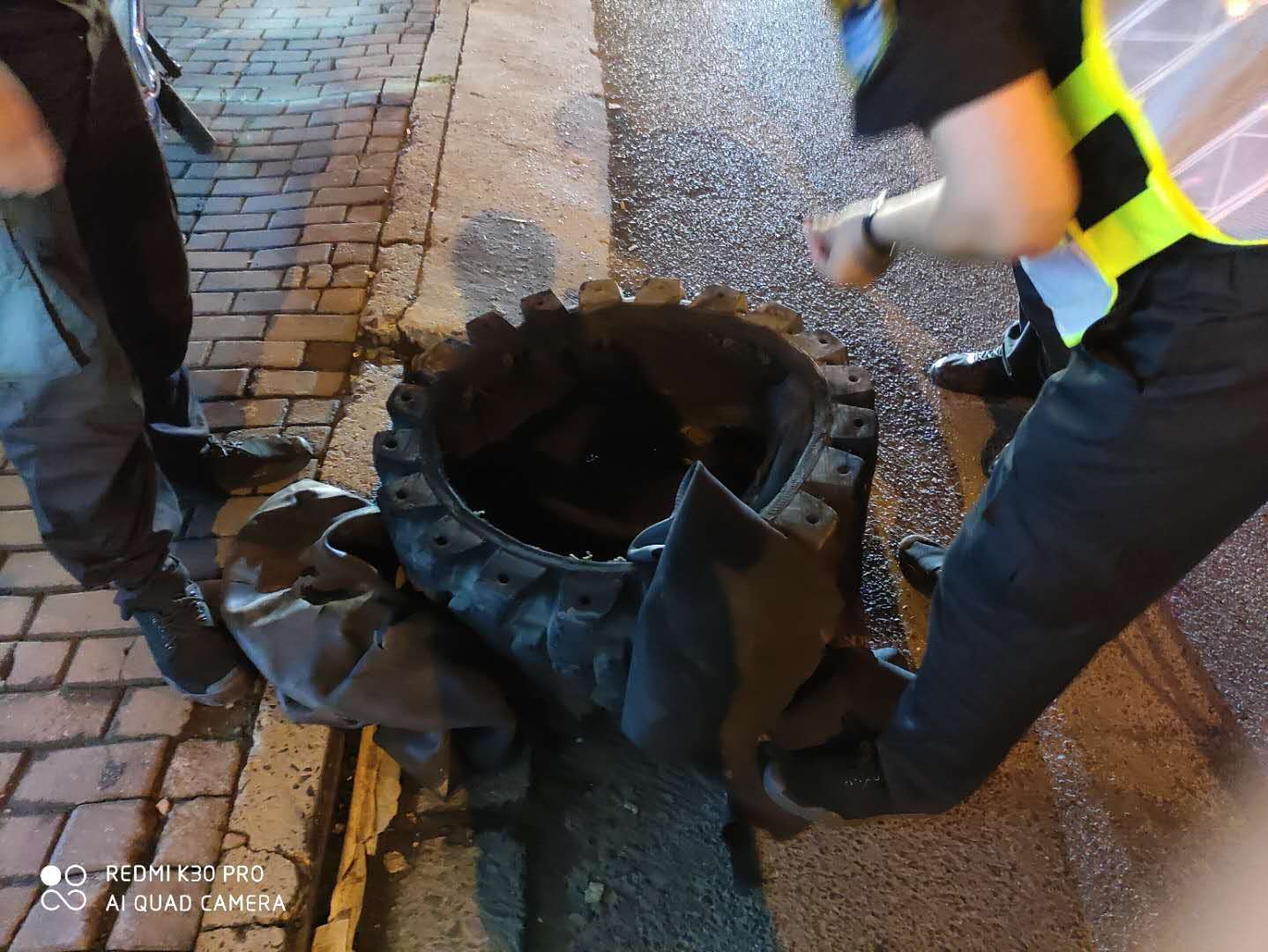 當(dāng)日19:00,孫橋輔警隊(duì)員結(jié)束交通整治工作后,在回派出所途中,發(fā)現(xiàn)一大塊車輛爆胎后的輪胎皮散落在孫橋路寶鼎皇宮對面馬路上,過往車輛有的變道躲閃,有的降速,有的干脆在輪胎上直接碾過去,存在較大的交通安全隱患。