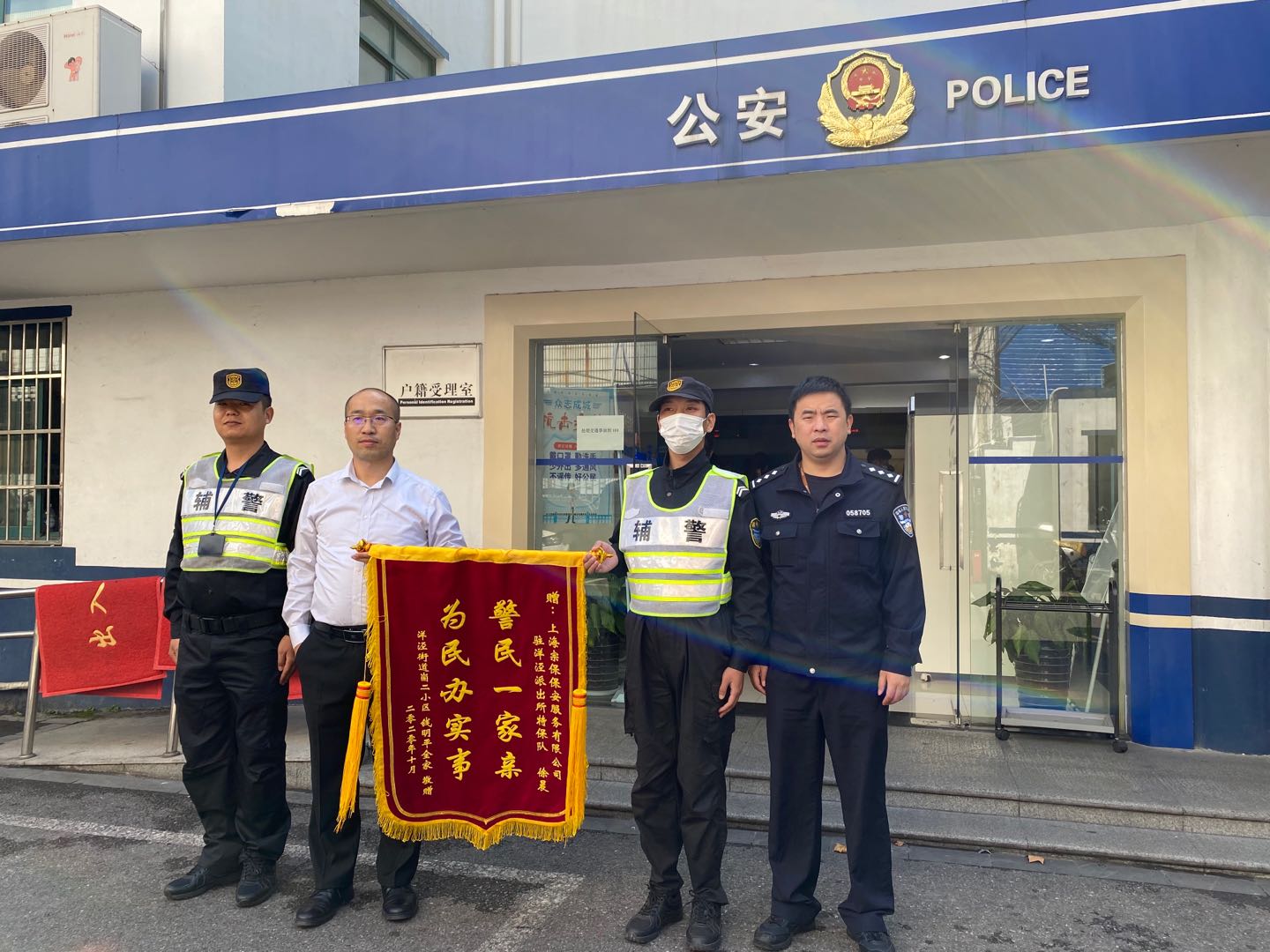 10月17日上午,宗保公司駐洋涇輔警項目收到走散兒童家長送來的繡有“警民一家親,為民辦實事”的錦旗。