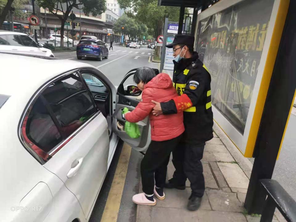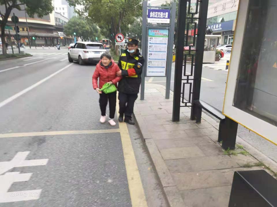 11月30日,浙江民泰保安服務(wù)有限公司駐臨平市容項(xiàng)目隊(duì)員余威幫助行走困難老人回家。